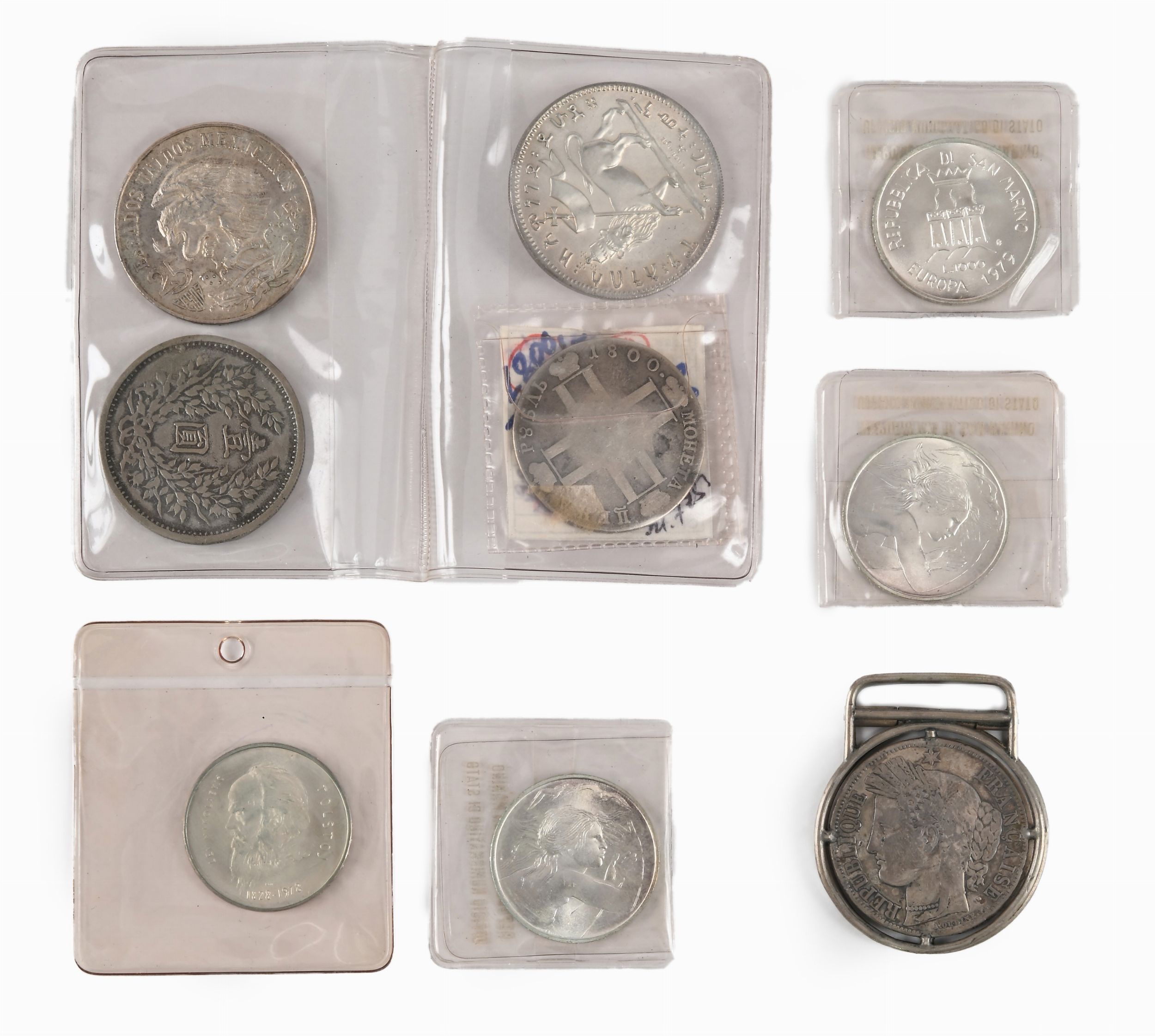 Lotto di 8 monete in argento e un fermasoldi con moneta da 5 Franchi 1841 Repubblica [..]
