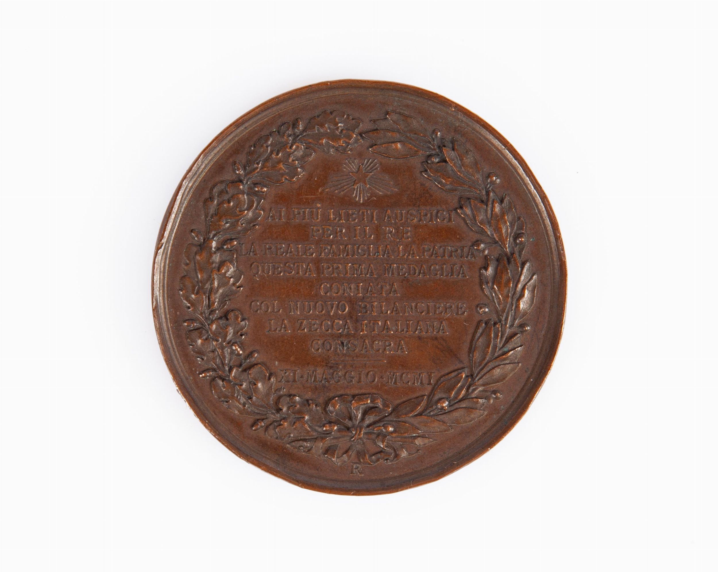 Bronzo. Emessa in occasione della prima coniazione col nuovo bilanciere della Zecca di Roma l'11 Maggio 1901