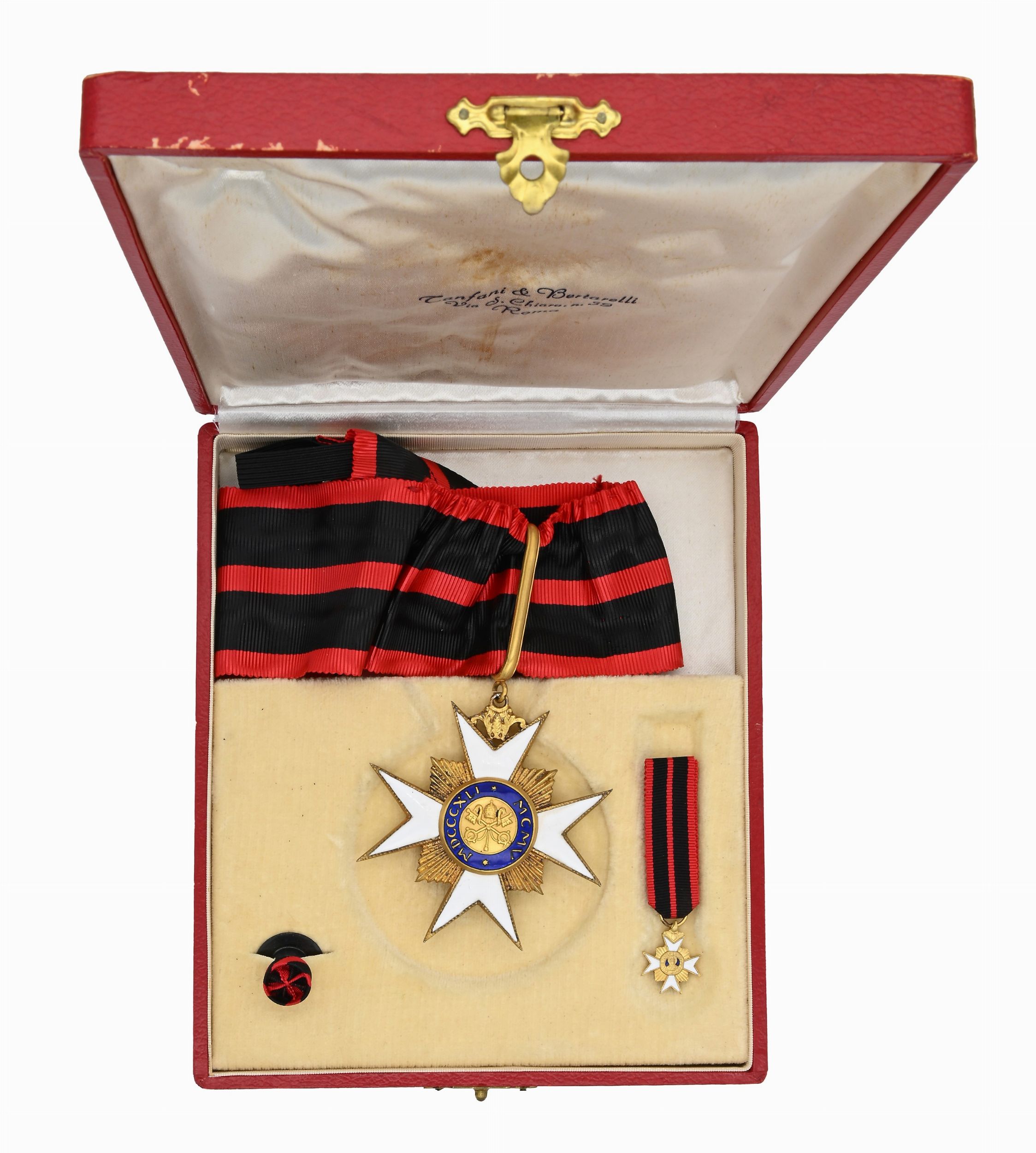 Metallo dorato e smaltato XX secolo Croce grande con nastro da collare, riduzione (distintivo da giacca) con nastrino e bottone. Entro astuccio originale Tanfani & Bertarelli Roma. Lievi difetti.