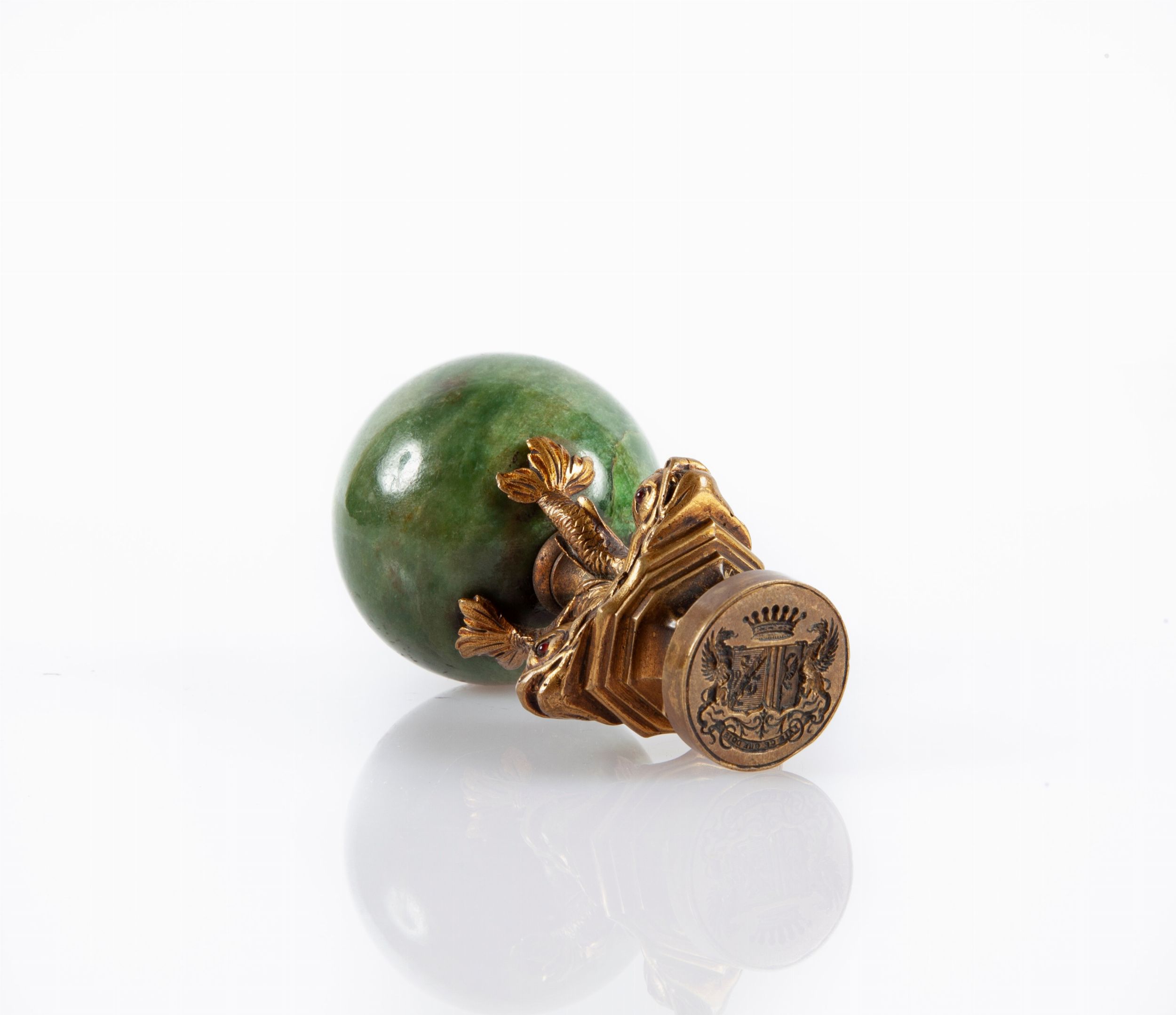 Sigillo in bronzo con 3 delfini che sorreggono una sfera di marmo