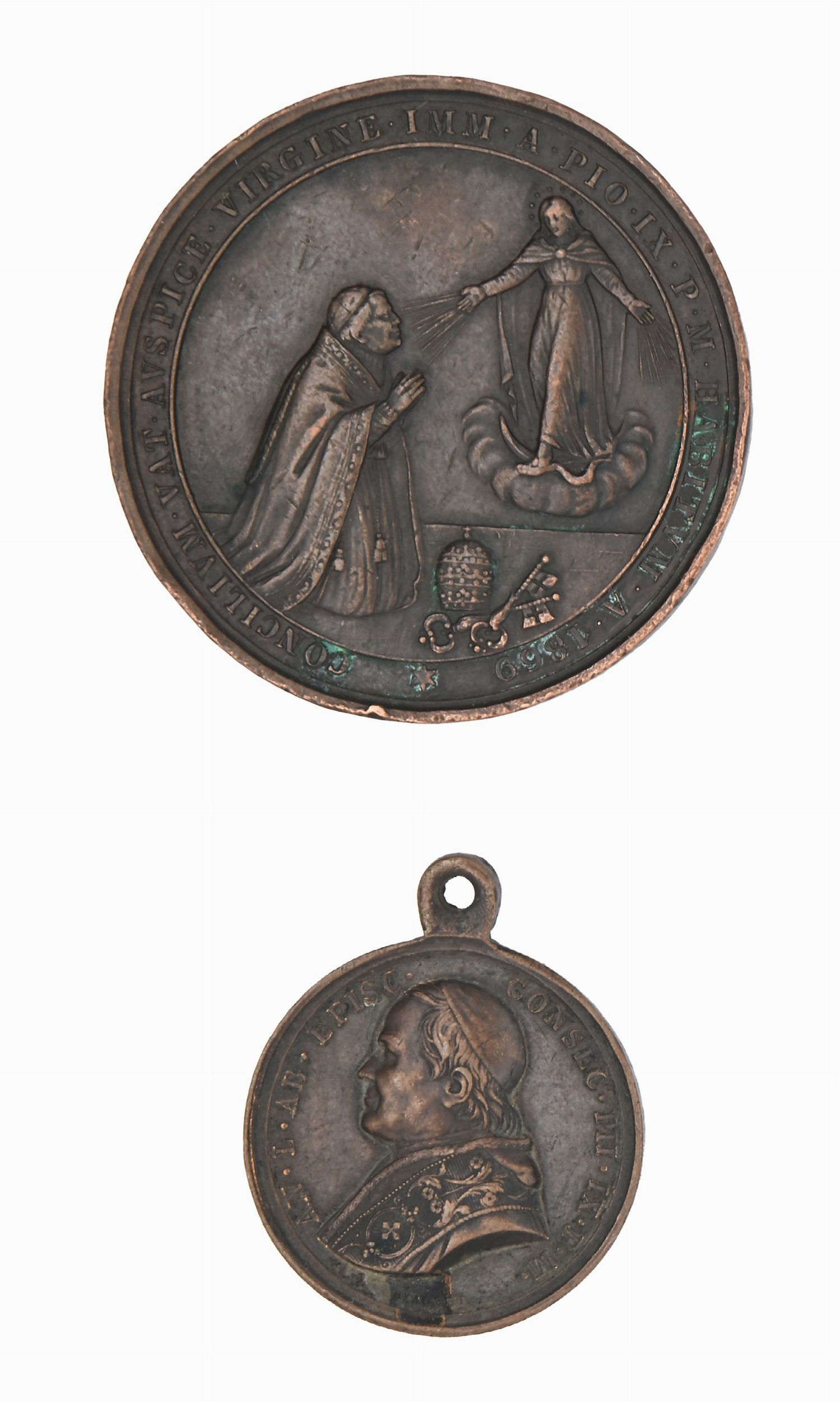 1) Peso gr. 42,60 D/ Il Papa genuflesso prega L'Immacolata su nubi a braccia aperte e coronata da stelle, sotto a terra il triregno e le chiavi CONCILIVM•VAT• AVSPICE• VIRGINE•IMM•A•PIO•IX•P•M•HABITVM•A•1869 R/ San Pietro in trono, al di sopra la Colomba dello Spirito Santo raggiante, ai suoi lati i quattro Padri della Chiesa VISVM• EST•SPIRITVI•SANCTO•ET•NOBIS