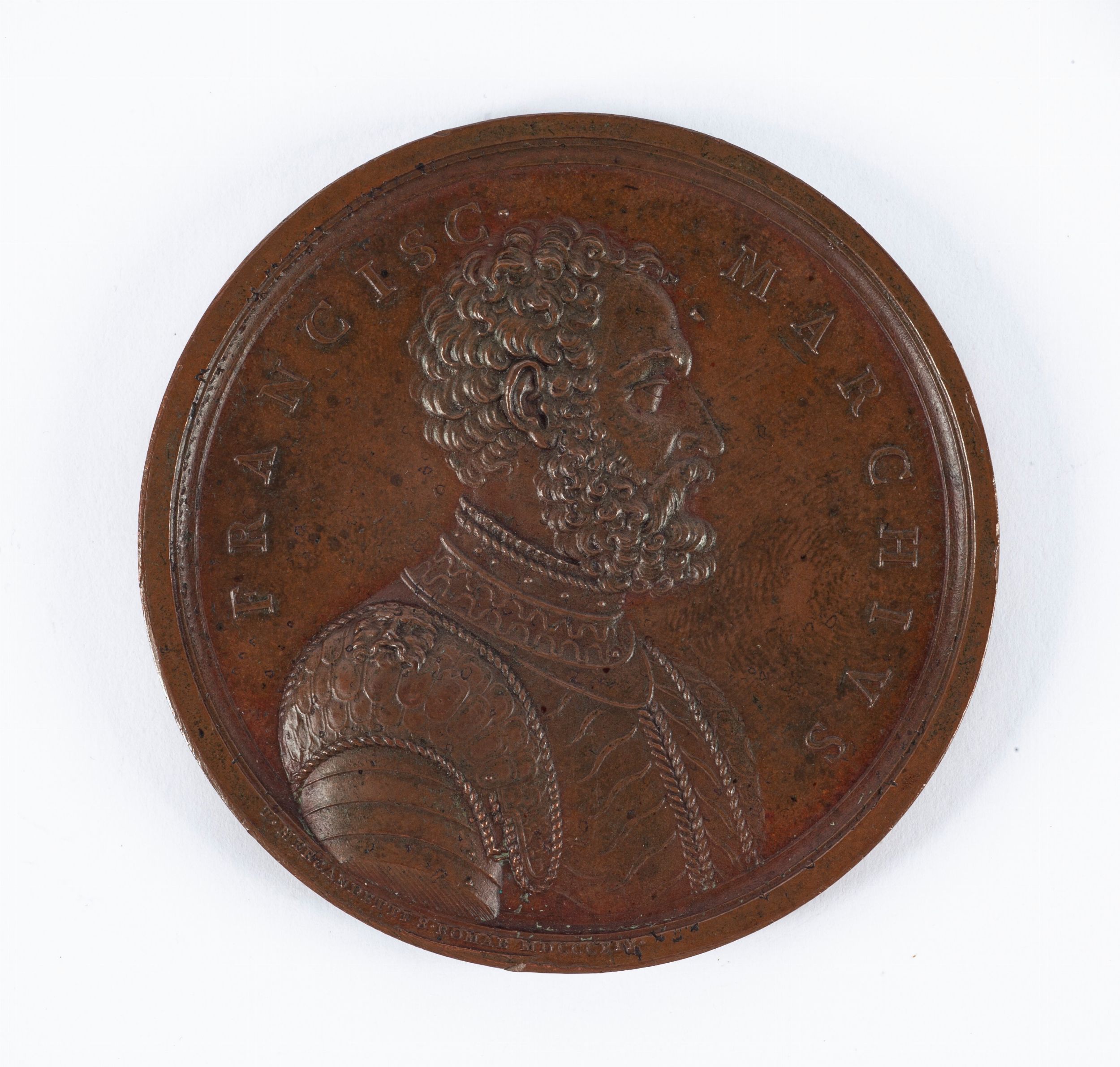 Diametro mm 68 D/ FRANCISC - MARCHIVS Busto corazzato; T MERCANDETTI S ROMAE MDCCCXIX; R/ MVNIENDI - ARTE - RENOVATA Lo stratega, corazzato e affiancato da due soldati, stante indica delle fortificazioni disegnate su pergamena che Minerva seduta con attributi gli porge; in esergo T MERCANDETTI F ET SCVLPSIT ROMAE MDCCCXIX; sotto TANTI VIRI SCRIPTA PENE OBLITA / NOVA NOBILISSIMA EDITIONE / INLVSTRAVIT / EQ ALOIS MARINVS. John. 412.