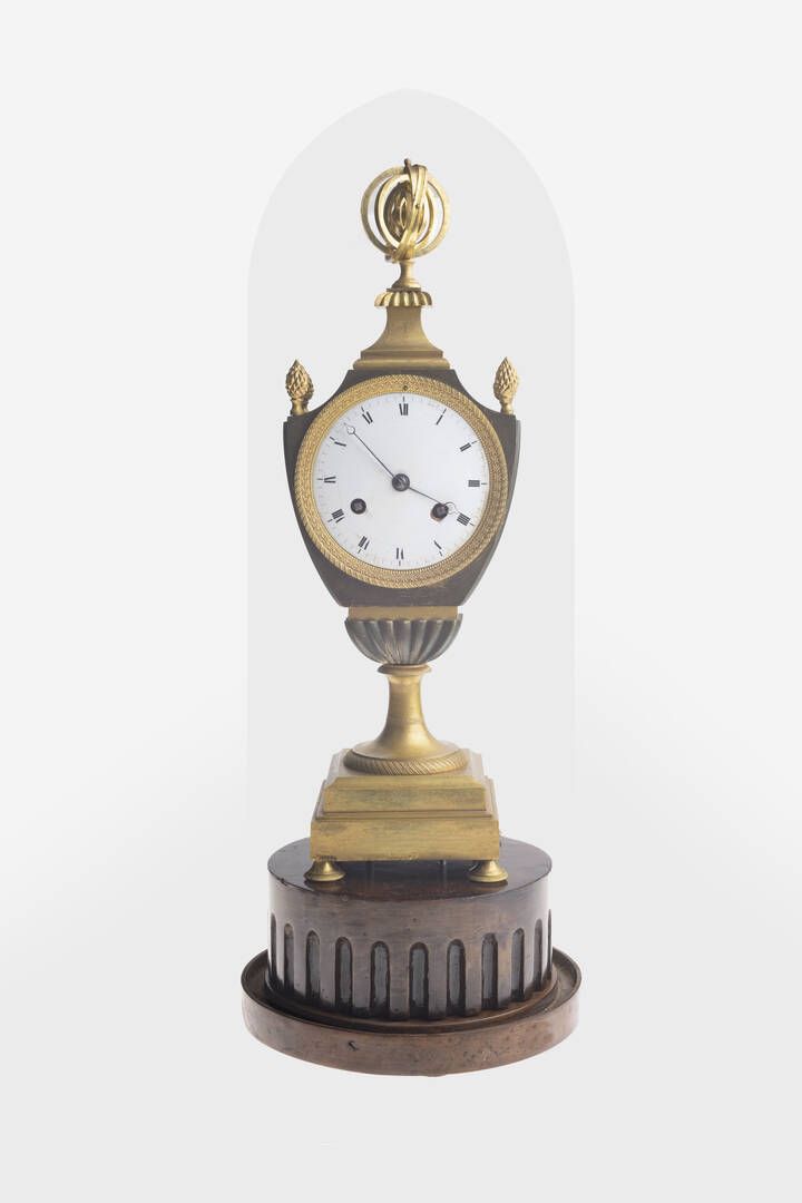 H 38 cm in bronzo dorato e patinato (difetti); Sommità a scudo con decoro superiore con astrolabio mobile; decori a pigna. Quadrante in smalto bianco con numeri serigrafati. Poggiante su base quadrata con piedini a cipolla.