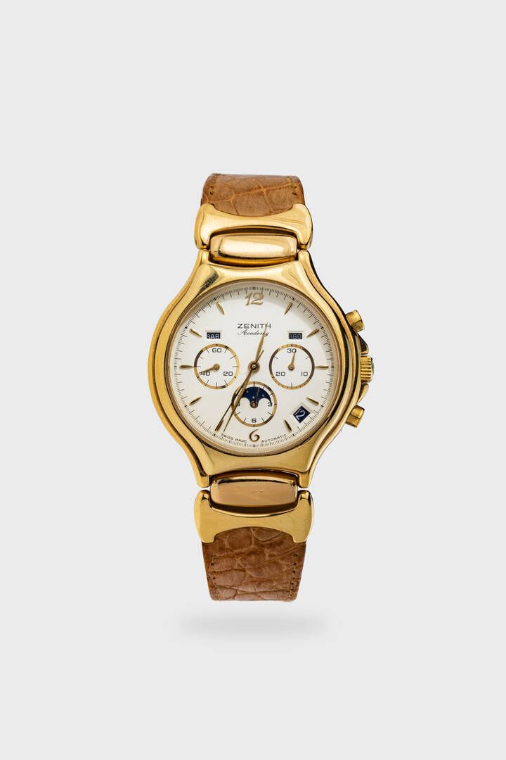 Diam. 39 mm Cassa placcata con assi basculanti. Quadrante beige con indici geometrici applicati. Per quanto riguarda la parte cronografica l'orologio presenta al 9 le indicazioni dei secondi continui al 3 quella dei 30 minuti cronografici ed al 6 quella delle 12 ore. Troviamo poi per quanto concerne la funzione di calendario il datario al 5 le fasi lunari al 6 le indicazioni del giorno della settimana al 10 ed il mese al 2. Movimento a carica automatica base 400. Orologio in stato di nuovo con tag applicato ma necessita la revisione.