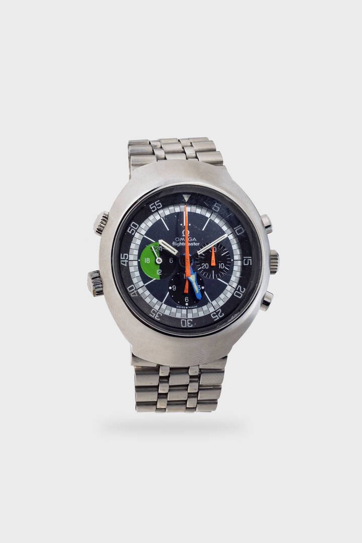 Diam. 43 mm Cassa in acciaio di forma tortue con fondello a vite. Quadrante racing nero con indicazione delle 24 ore al 9 delle 12 ore al 6 e dei 30 minuti cronografici al 3. Bracciale integrato Omega in acciaio con chiusura clasp. Movimento a carica manuale cal.910.