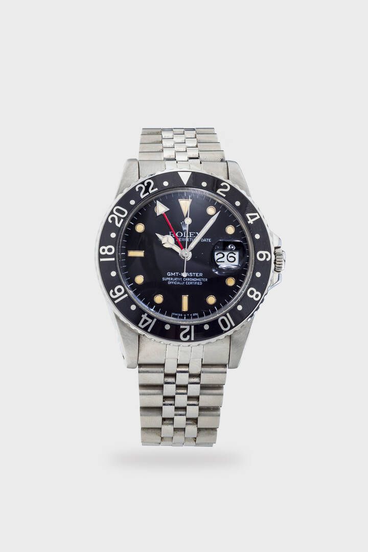 Diam. 40 mm Cassa in acciaio con lunetta girevole bidirezionale nera. Quadrante nero lucido con indici geometrici applicati detti Bicchierini e datario al 3. Presente la lancetta ausiliaria per il secondo fuso orario. Bracciale in acciaio Jubilee con chiusura clasp. Movimento a carica automatica cal.3075. Referenza molto rara transizionale che divide la produzione tra vetro plexiglass e zaffiro. Tra le altre cose nel 1983 si passa da quadrante Pallettoni a Bicchierini rendendo questo oggetto un transizionale tra i transizionali.