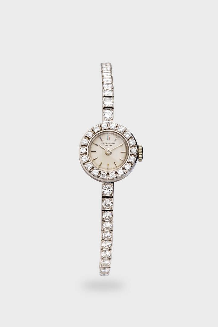Diam. 16 mm Cassa in oro con lunetta in diamanti. Quadrante argento con indici geometrici applicati. Bracciale composto da un tennis di diamanti di grandi dimensioni con chiusura a scomparsa. Movimento a carica manuale. Orologio di grande pregio corredato di box dell'epoca e controscatola.