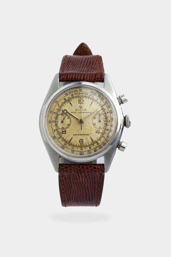 Diam. 36 mm Cassa in acciaio con fondello a vite. Quadrante argento con patina vintage indici geometrici intervallati da numeri arabi applicati. Al 9 subcontatore dei secondi continui ed al 3 quello dei 30 minuti. Movimento Valjoux a carica manuale. Orologio di grande pregio e rilevanza storica.