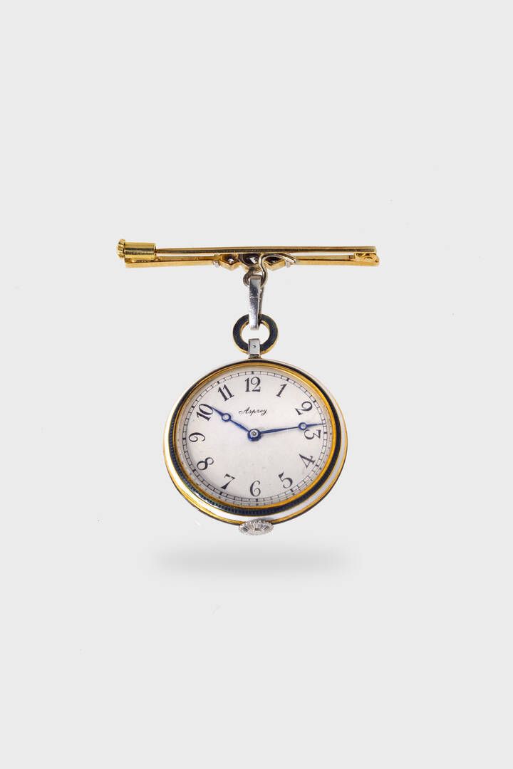 Cassa in oro con fondello smaltato. Quadrante argento con numeri arabi serigrafati. Movimento a carica manuale.