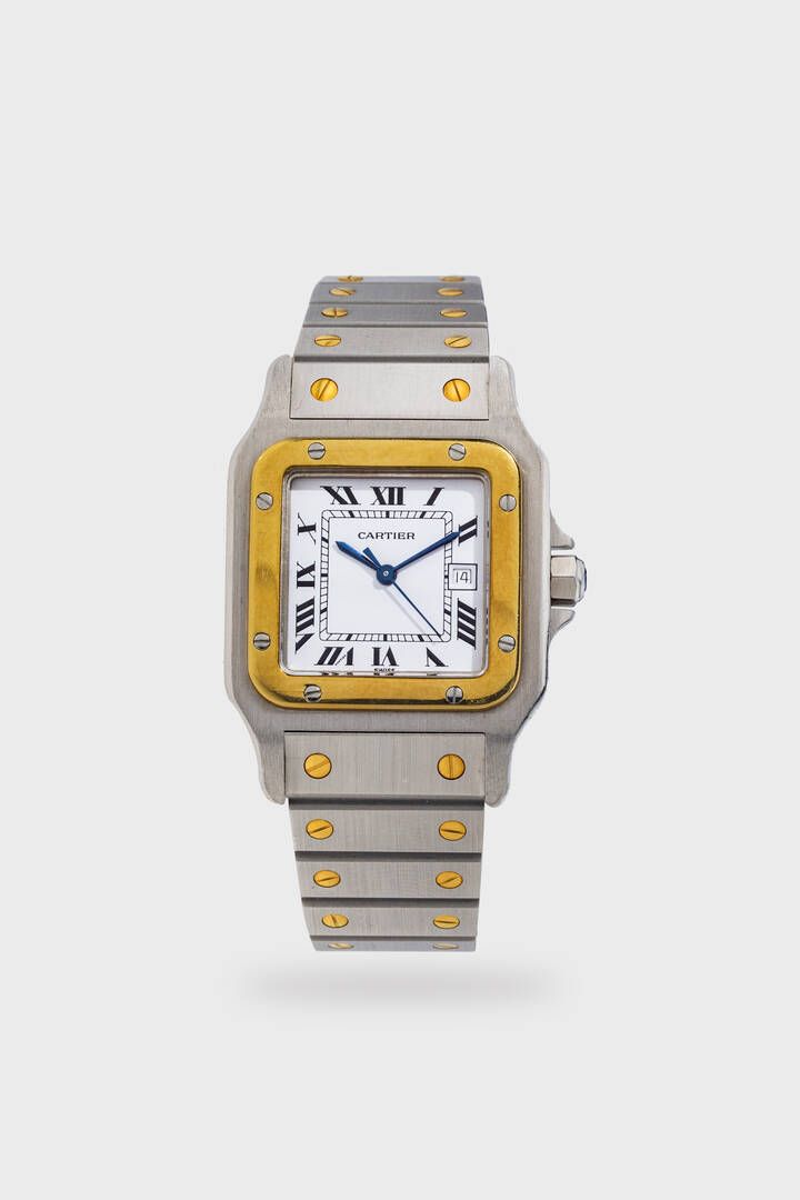 29x41 mm Cassa in acciaio con lunetta in oro. Quadrante bianco con numeri romani serigrafati e datario al 3. Bracciale in acciaio e oro marchiato Cartier con chiusura clasp. Movimento a carica automatica. Orologio completo di scatola garanzia e libretti dell'epoca.