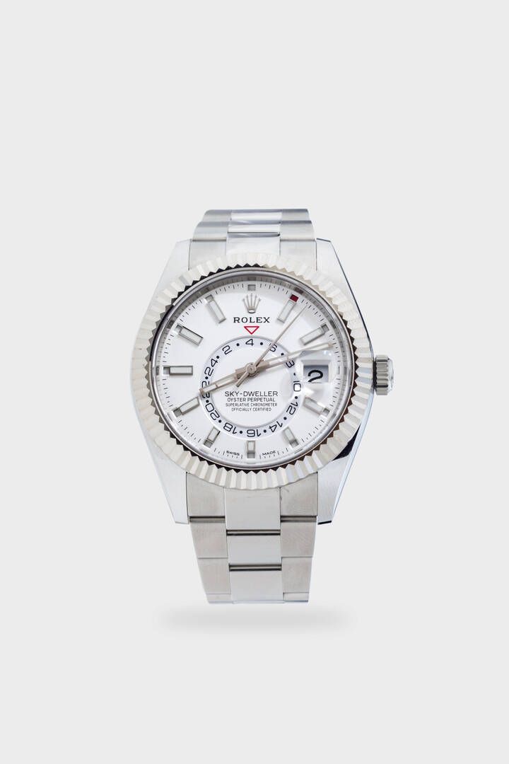 Diam. 42 mm Cassa in acciaio con lunetta in oro bianco godronata. Quadrante argento con indici geometrici applicati. L’Oyster Perpetual Sky-Dweller permette ai viaggiatori di leggere simultaneamente l’ora di due fusi orari. Quando si viaggia l’ora di riferimento è visualizzata su un disco girevole decentrato in formato 24 ore ed è indicata tramite un triangolo rosso fisso. L’ora locale è indicata tramite le tradizionali lancette delle ore. L’Oyster Perpetual Sky-Dweller dispone di un calendario annuale che distingue automaticamente i mesi di 30 da quelli di 31 giorni. Lungo tutto l’arco dell’anno il calendario indica la data corretta richiedendo un’unica regolazione il 1° marzo in base alla durata del mese di febbraio di 28 o 29 giorni. Il mese corrente è indicato in rosso all’interno di una delle 12 finestrelle che seguono il bordo del quadrante: gennaio a ore 1 febbraio a ore 2 ecc. Bracciale in acciaio integrato con chiusura clasp. Movimento a carica automatica cal.9001 Orologio full set unico proprietario. Completo di libretti e garanzia originale card.
