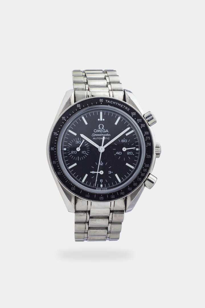 Diam. 39 mm Cassa in acciaio con fondello a pressione e tasti a pompa della cronografia. Quadrante nero con indici luminescenti contatore dei secondi continui al 3 delle 12 ore al 6 e dei 30 minuti al 9. Bracciale integrato in acciaio con chiusura clasp. Movimento a carica automatica. Orologio completo di scatola e garanzia card