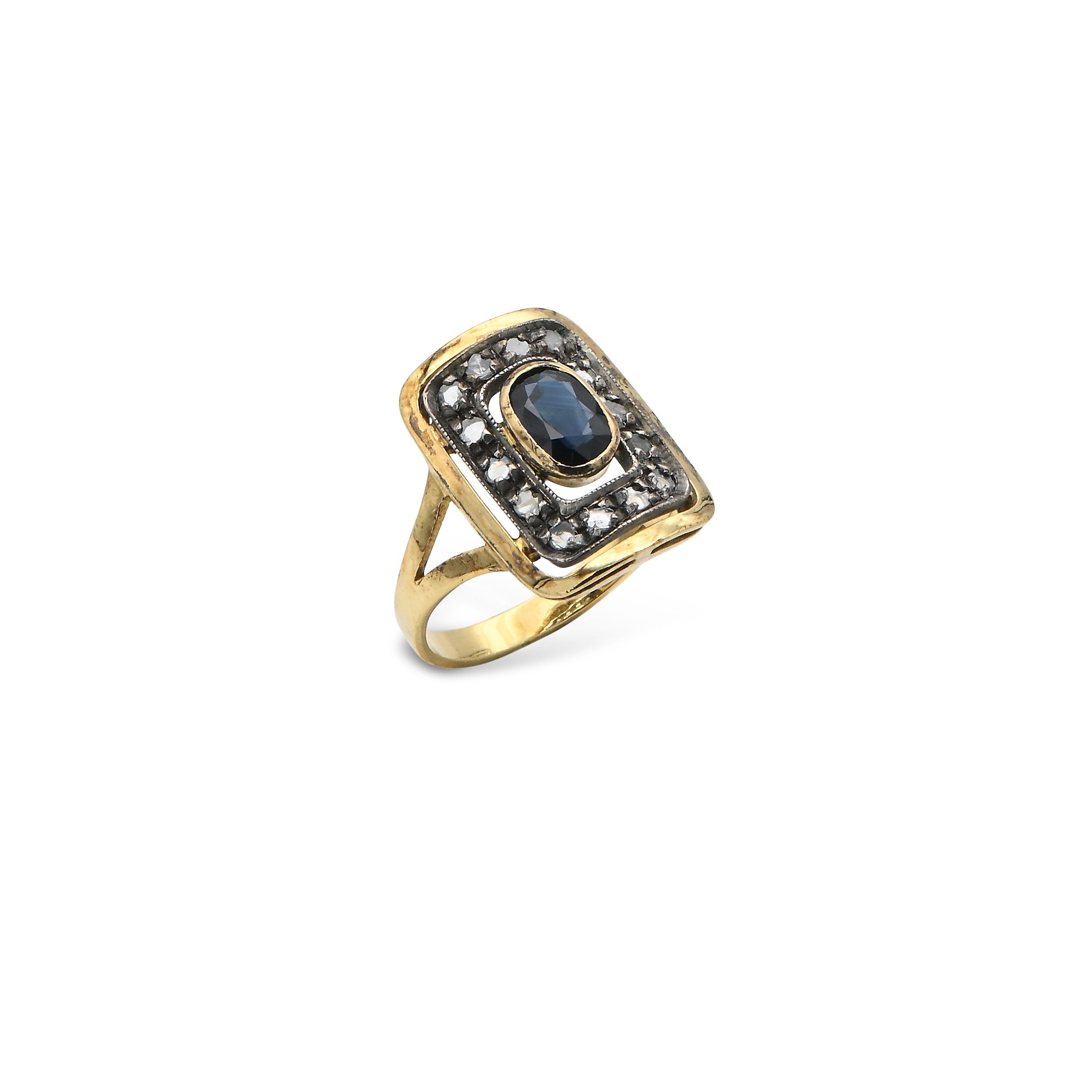 Anello antico in oro e argento, diamanti e zaffiro