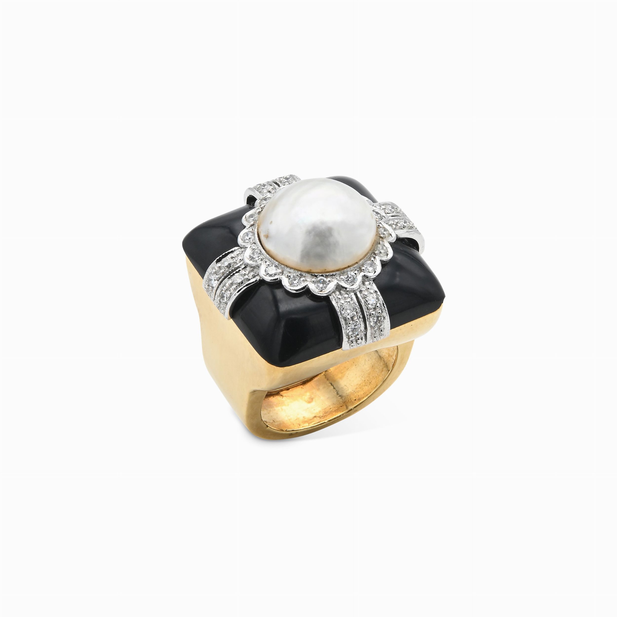 Anello da cocktail in oro, brillanti, onice e perla