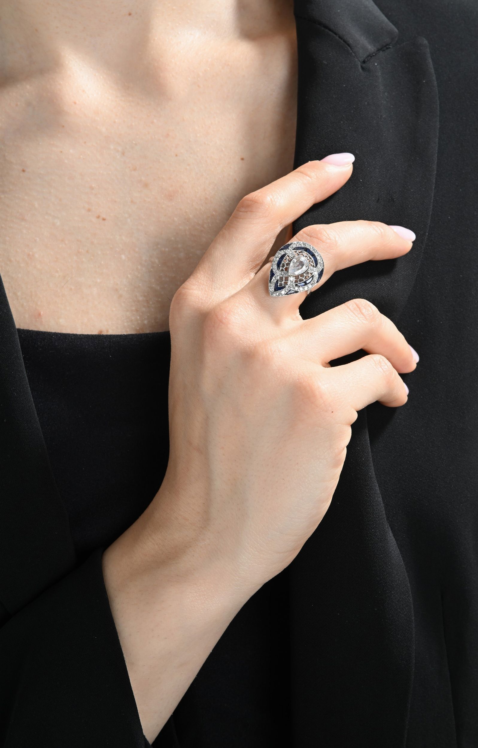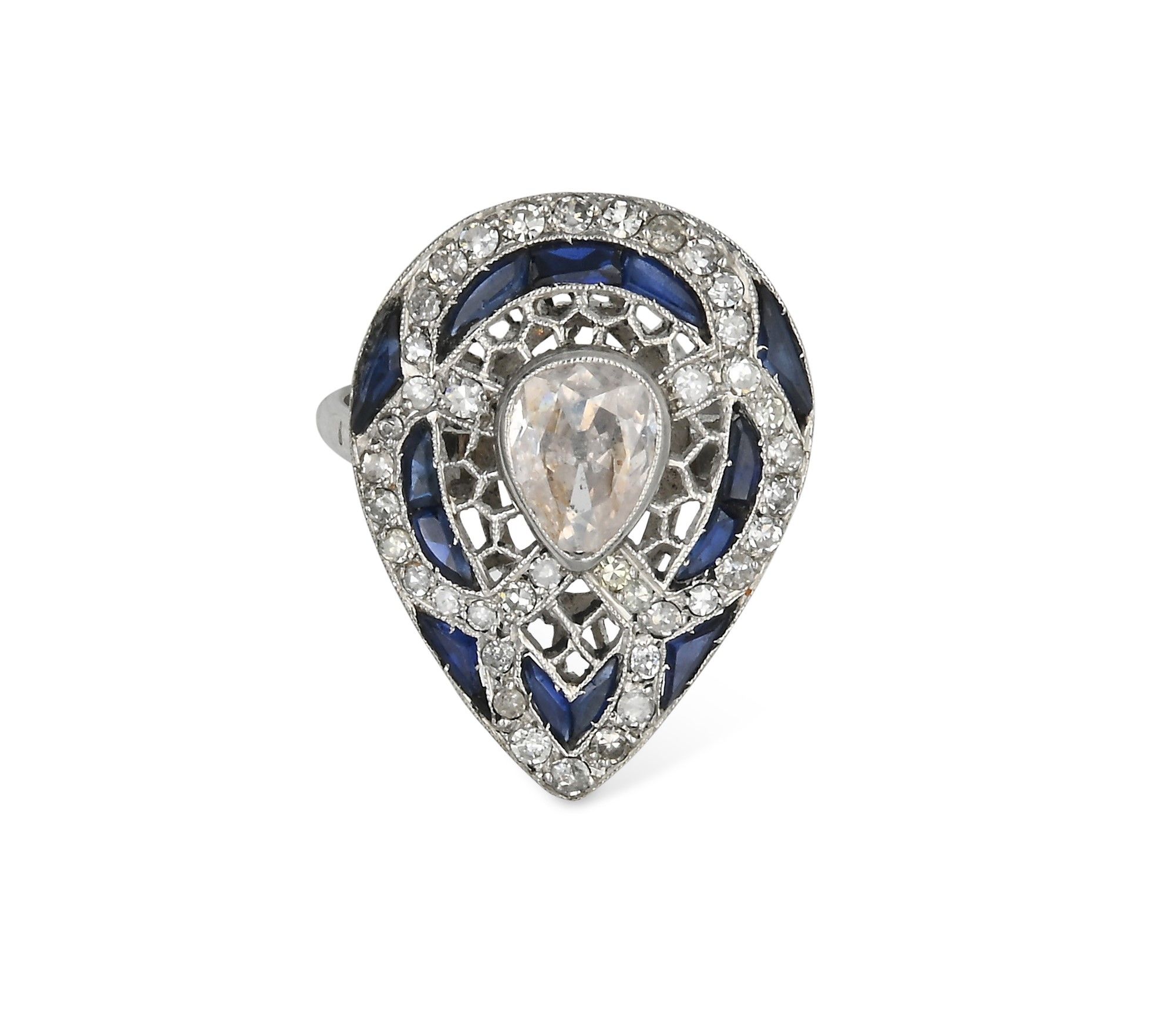 Anello decò a goccia in platino, diamanti e zaffiri