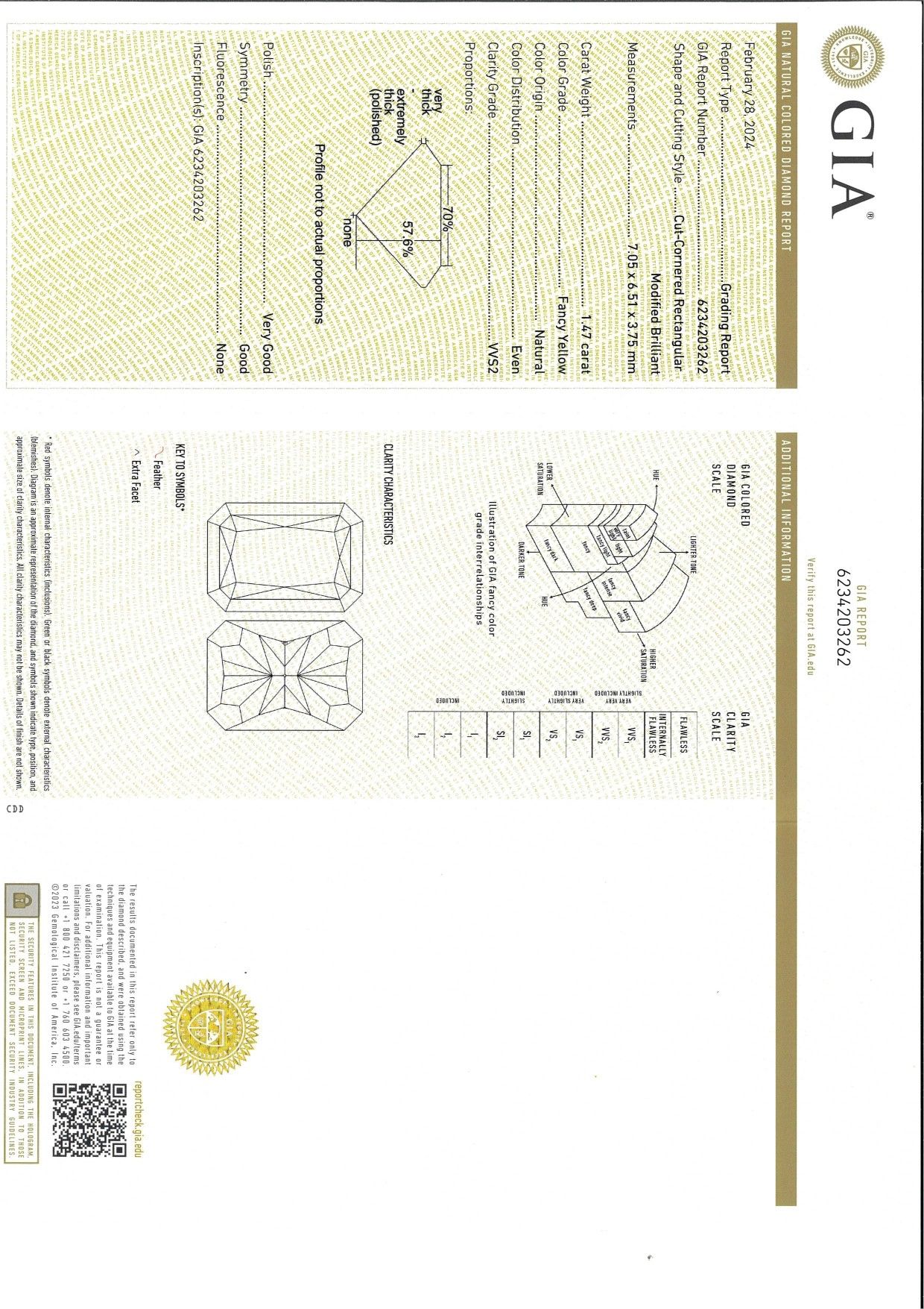 Oro bianco 750/000. Diamante centrale fancy yellow, in taglio brillante forma rettangolare ad angoli tronchi ct. 1,47. Peso complessivo gr. 5,30. Corredato di certificazione GIA n° 6234203262