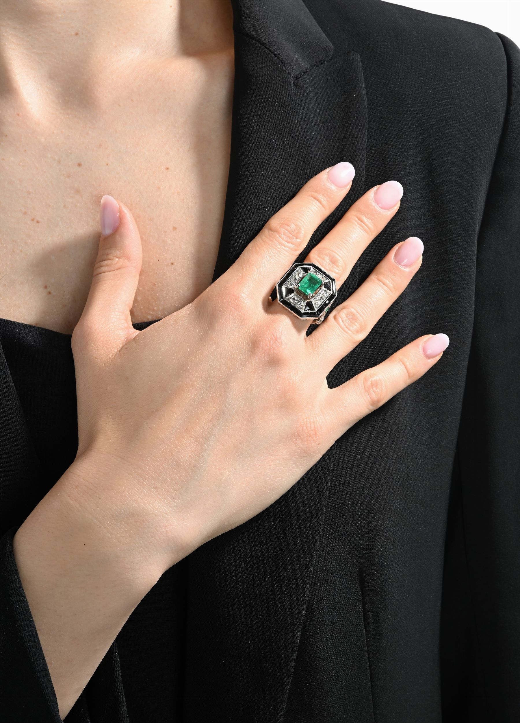 Platino 950/000. Smeraldo in taglio smeraldo ct. 2,50 ca. Diamanti in taglio rotondo ct. 1,50. Peso complessivo gr. 12,30