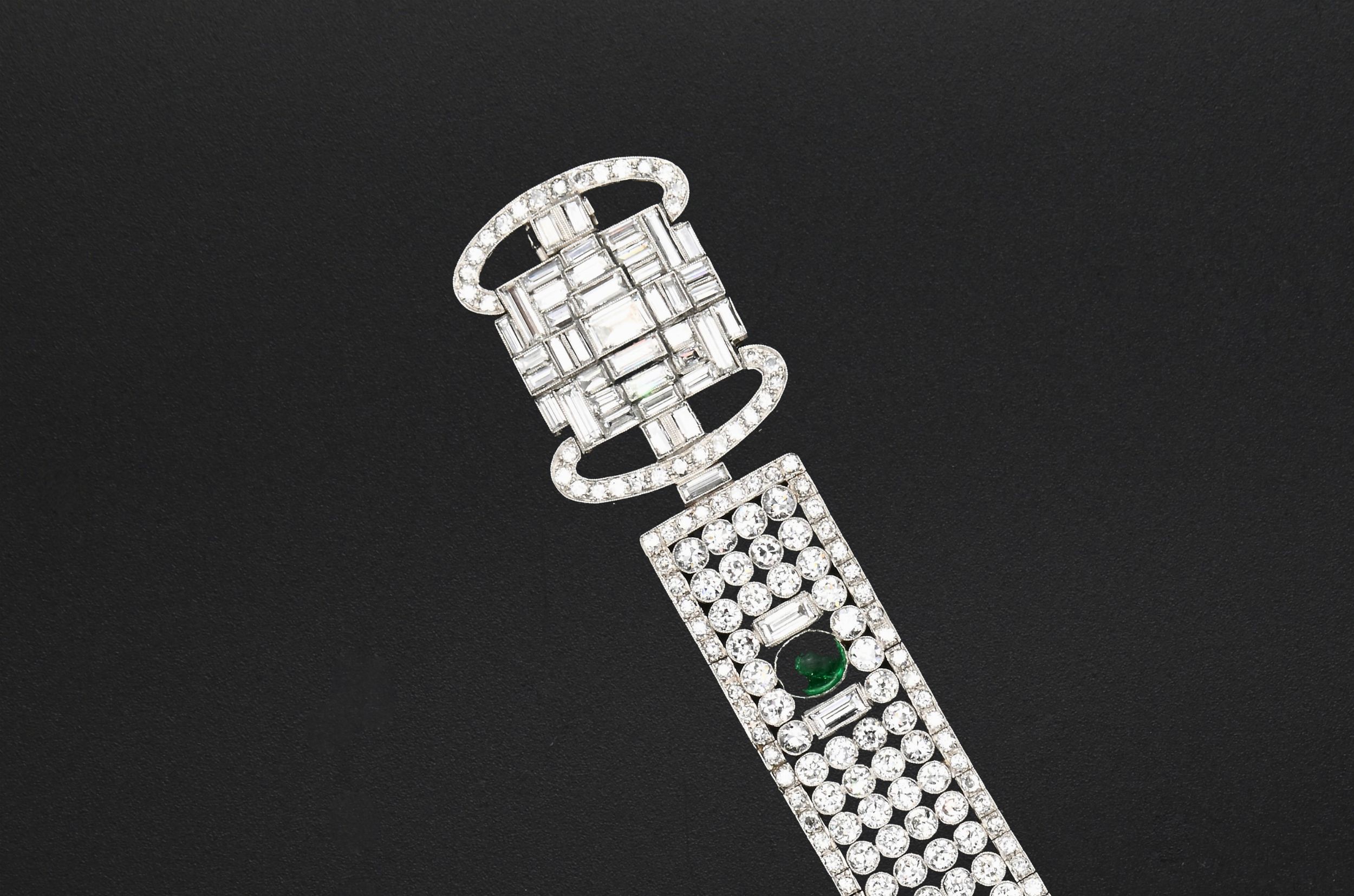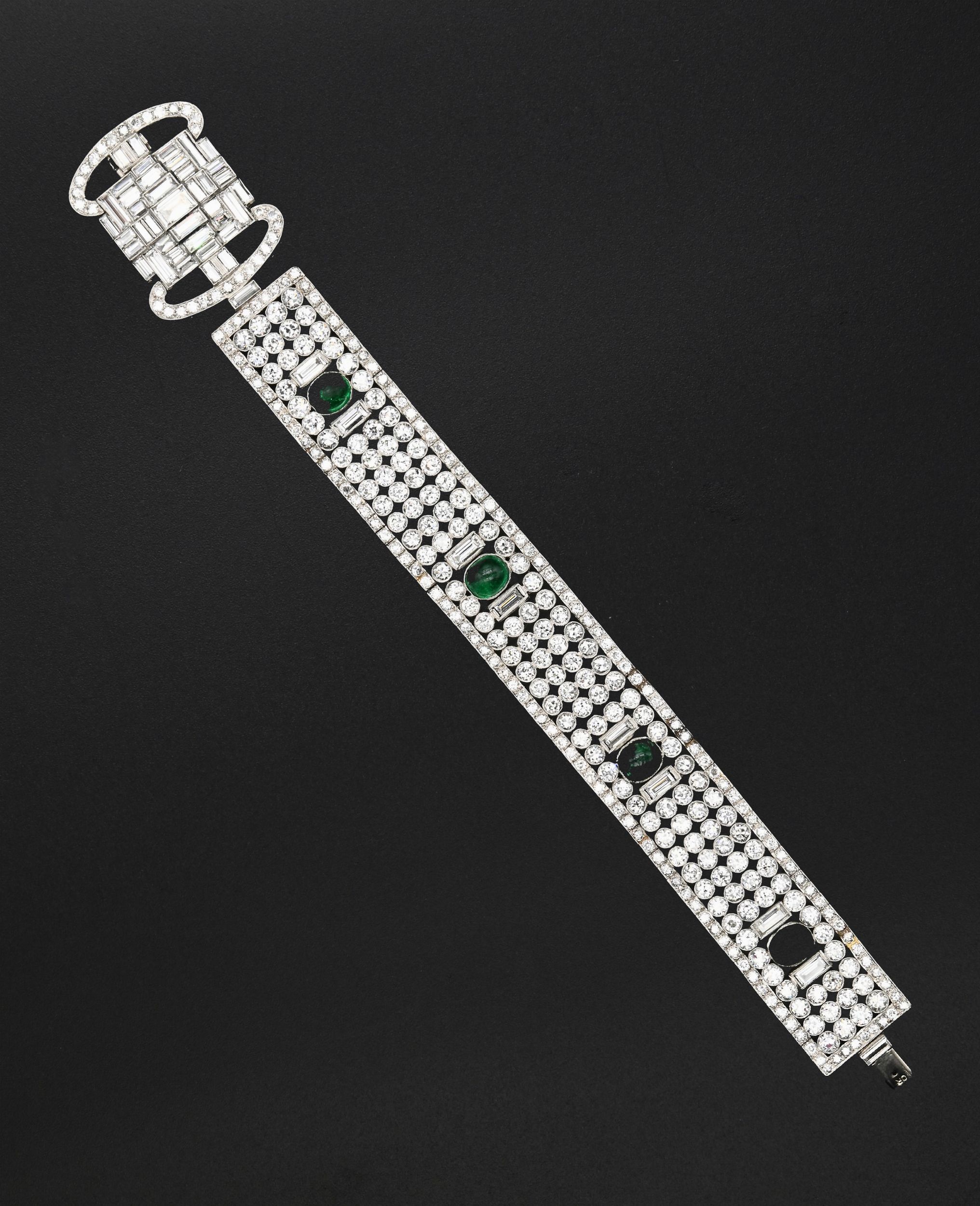 Bracciale decò in oro, platino, diamanti e smeraldi
