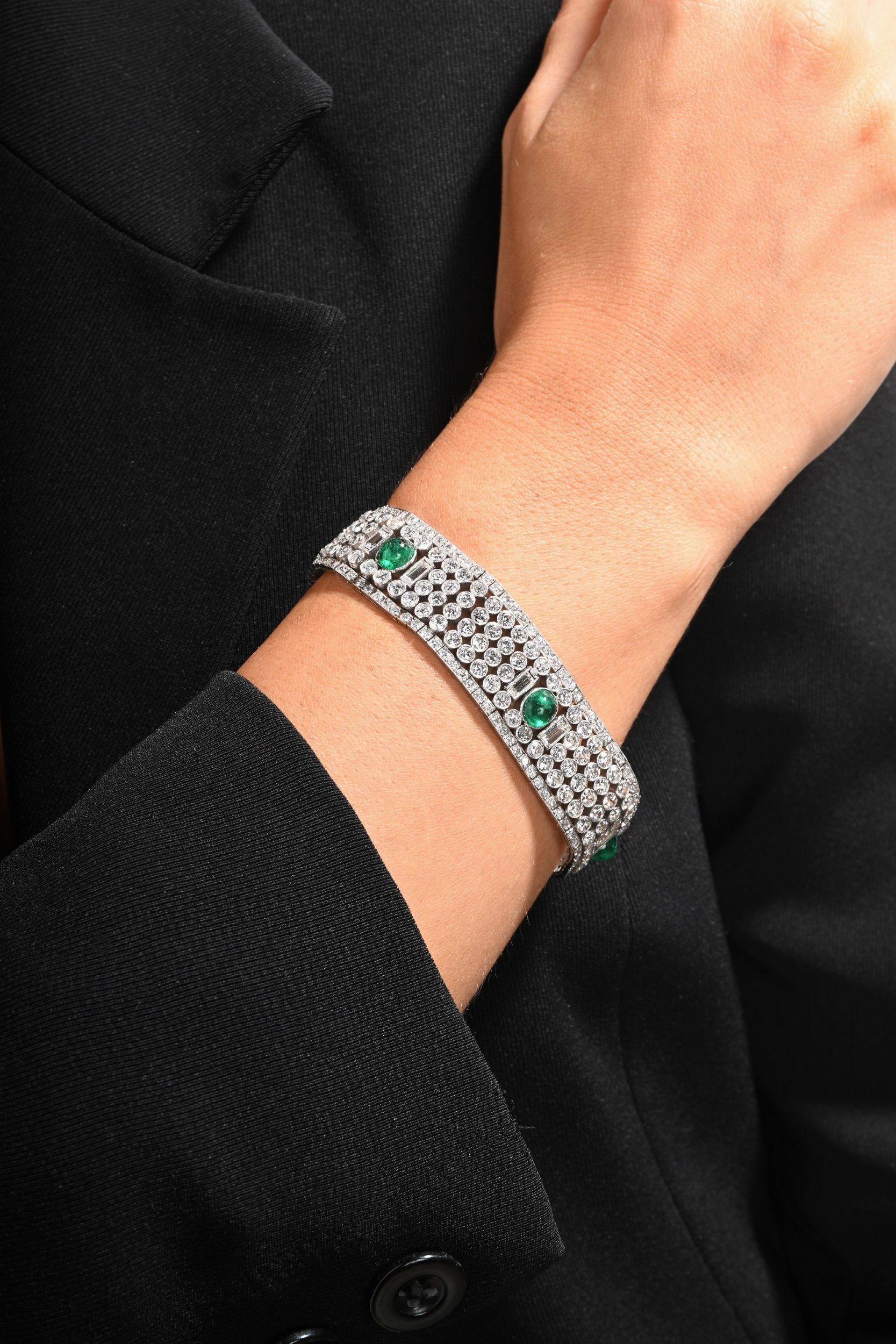 Oro e platino. Diamanti in taglio rotondo e tagli baguettes ct. 22ca, prob F-G, VVS-VS. Smeraldi naturali in taglio cabochon ct. 5 ca. Peso complessivo gr. 62,40