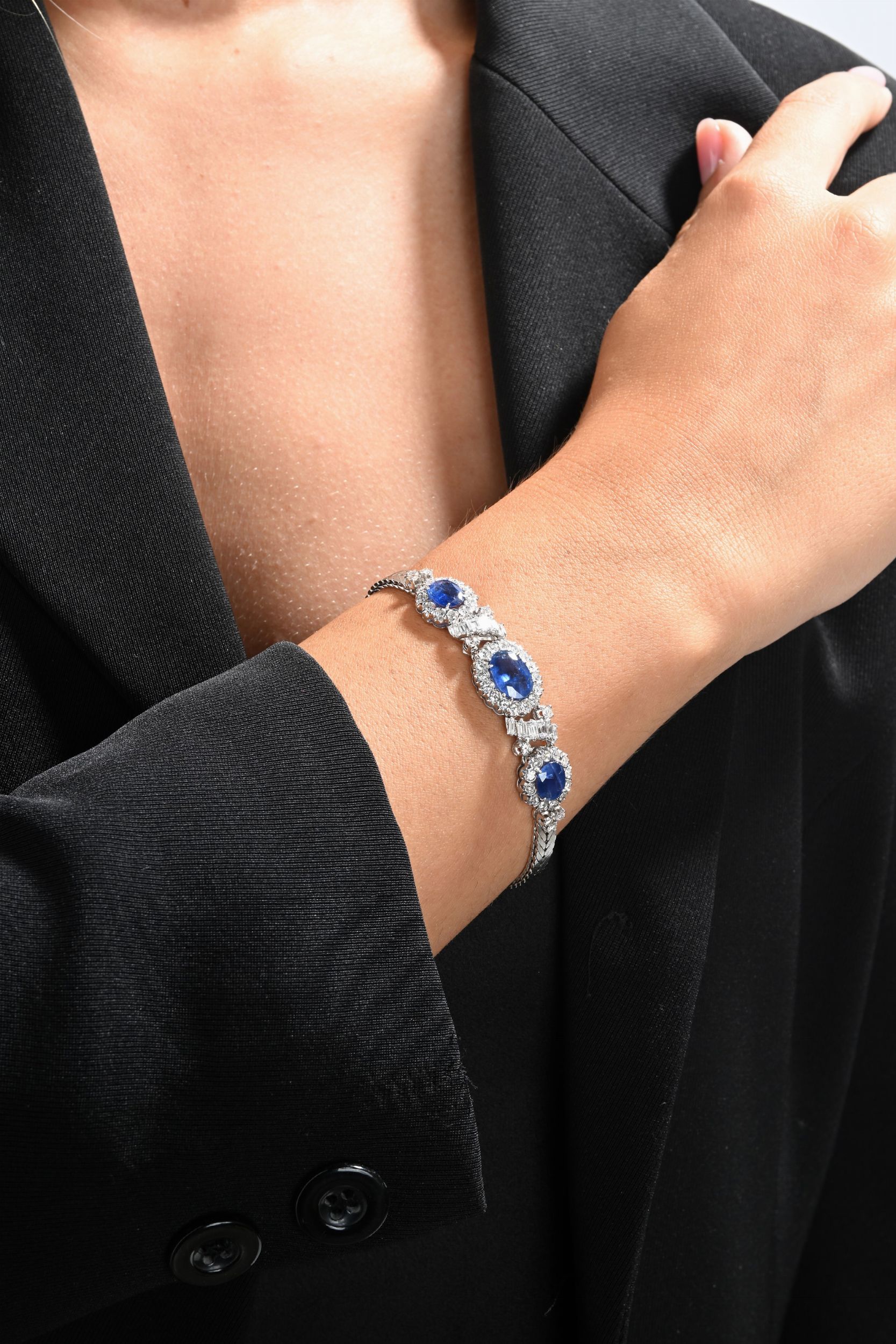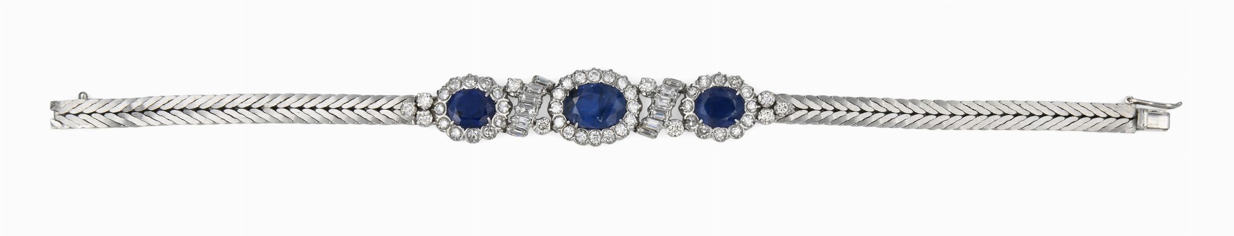 Lunghezza cm 18 Oro bianco 750/000. Zaffiri naturali in taglio ovale ct. 6, SENZA INDICAZIONE DI TRATTAMENTO TERMICO, provenienza Sri Lanka (Ceylon), diamanti in taglio rotondo e a gradini, ct. 2,80, G-H, VVS. Peso complessivo gr. 23,60. Corredato di certificazione gemmologica.