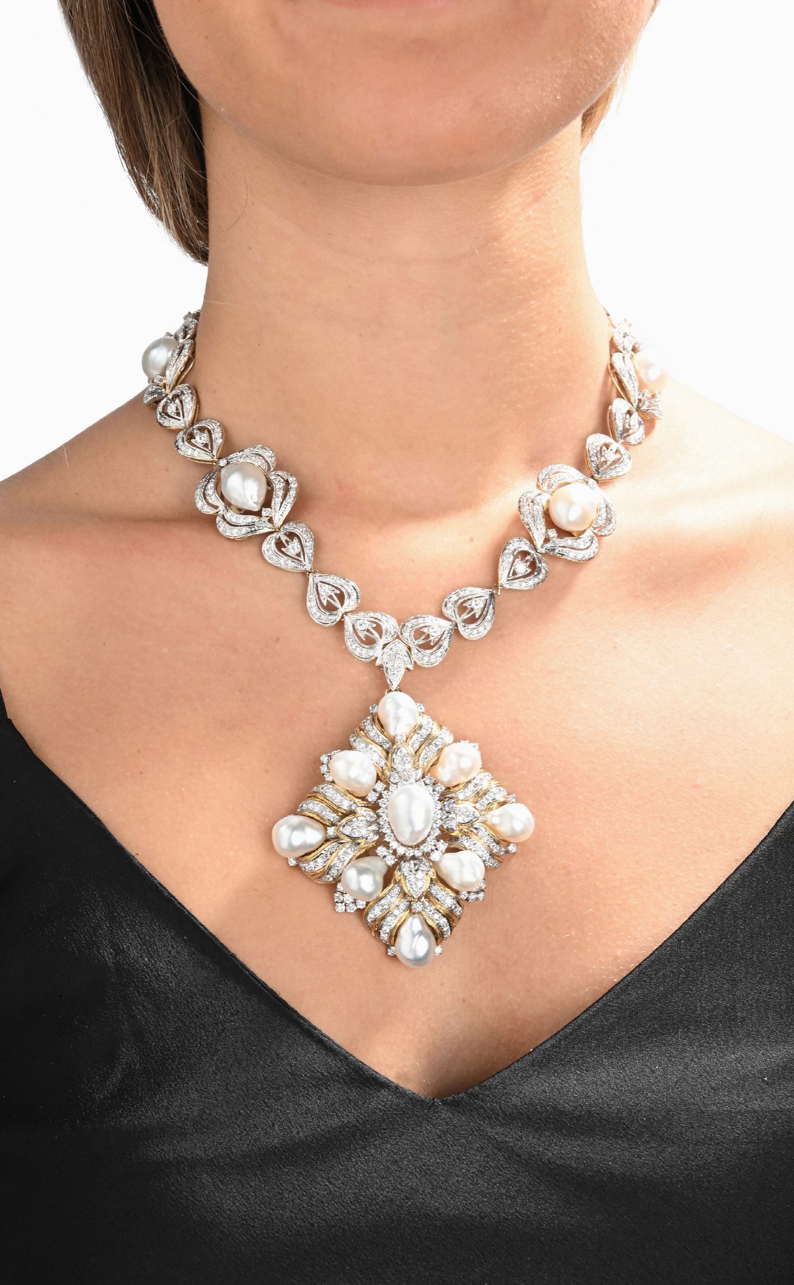 Lunghezza cm 45, pendente 7 x 6 Oro bianco e giallo 750/000 la collana e 585/000 il pendente. Perle barocche South Sea mm 11/13, diamanti in taglio rotondo brillante ct. 11ca F-G, VVS-VS. Peso complessivo gr. 158