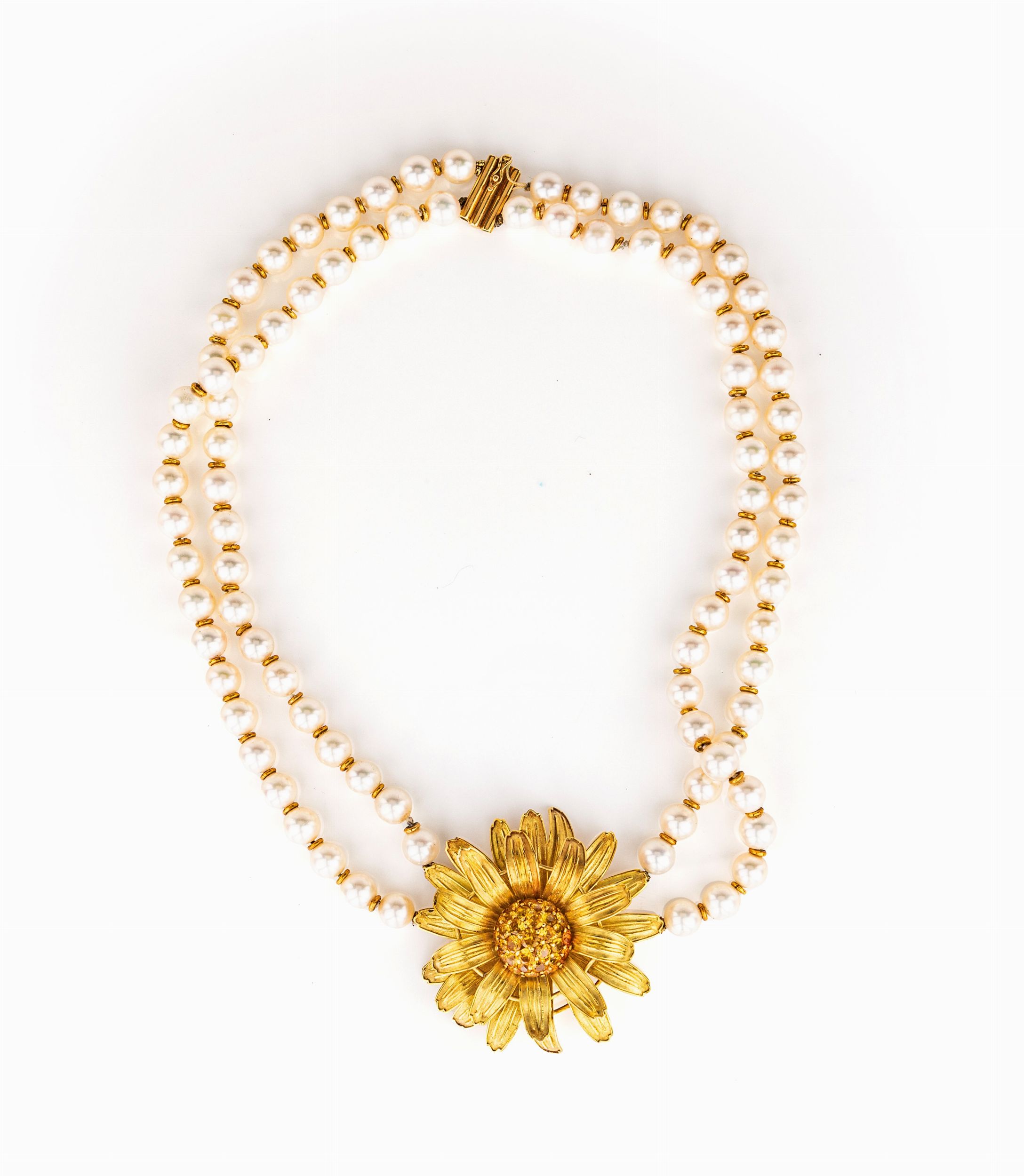 Collana di perle a due fili con centrale e chiusura in oro e topazi