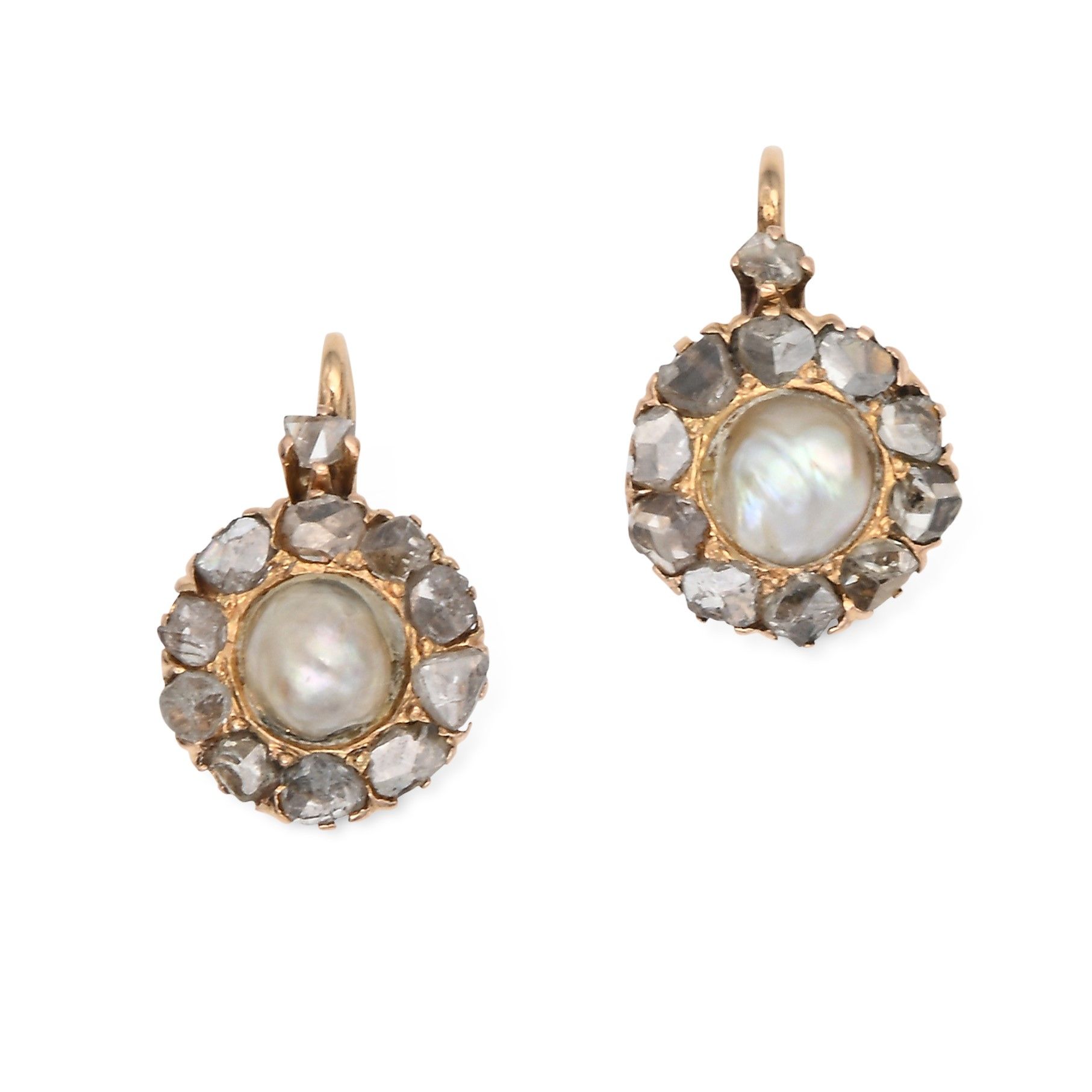 Oro giallo 750/000. Diamanti in taglio rosa ct. 2,10. Perle naturali spontanee mm. 5,40/6,10. Peso complessivo gr. 4,50. corredati di certificazione IGN n° 32342.