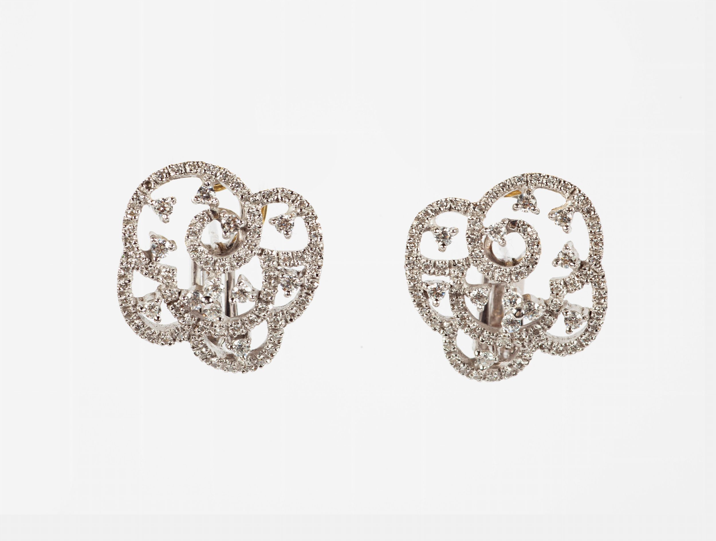 Oro bianco 750/000. Diamanti in taglio rotondo brillante ct. 1,50 ca. Peso complessivo gr. 16. Chiusura perni e clips.