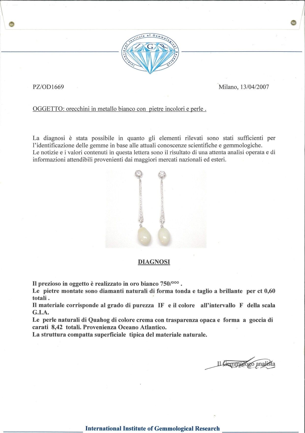 Lunghezza cm 5 Oro bianco 750/000. Perla naturale spontanea Quahog ct. 8,42 mm 7x10,5/7,5x11.Diamanti in taglio rotondo brillante ct. 0,60, F, IF. Peso complessivo gr 4,7.Corredato di certificazione gemmologica IGR n° 1669