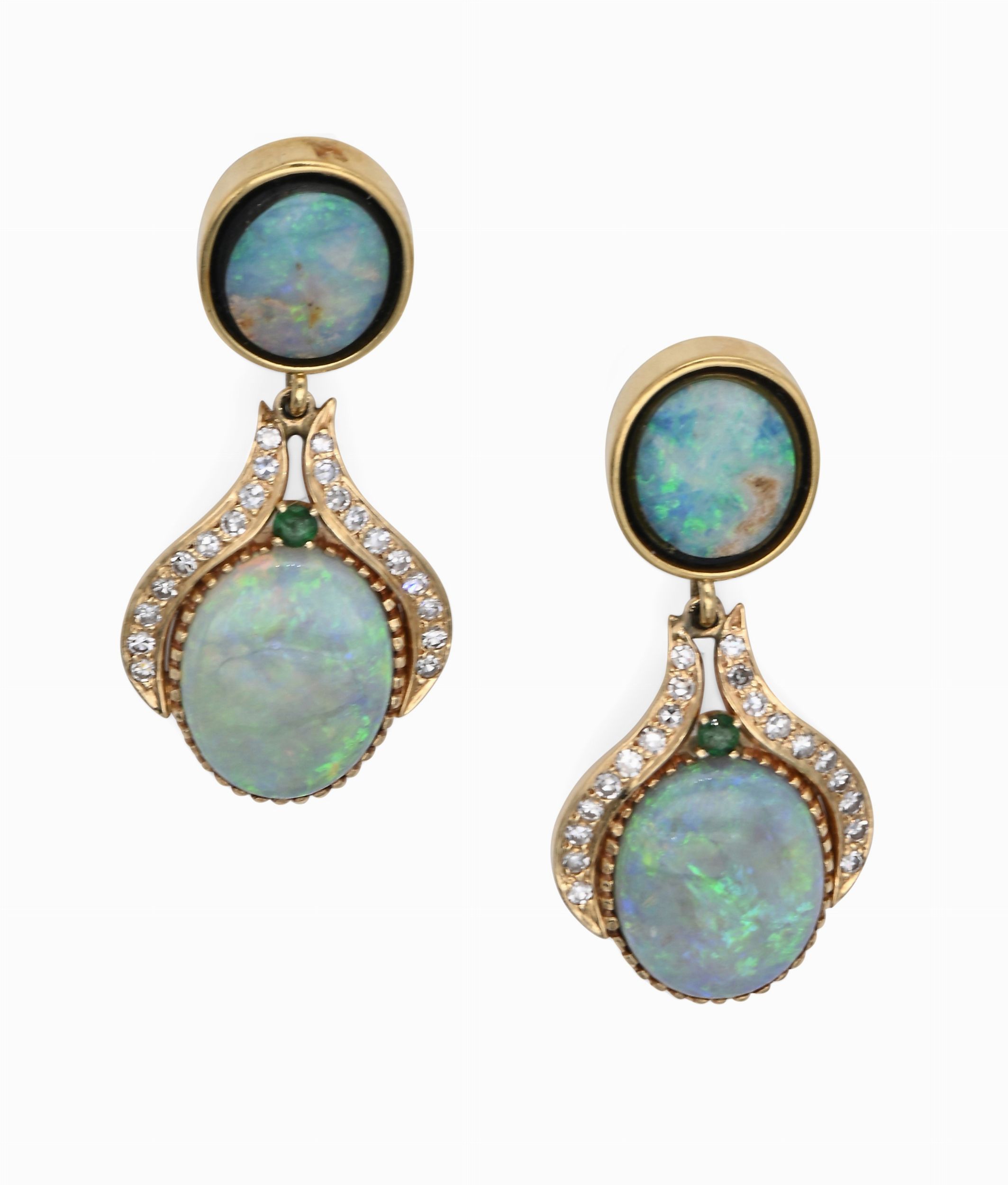 Coppia di orecchini pendenti in oro, opali, brillanti e smeraldi