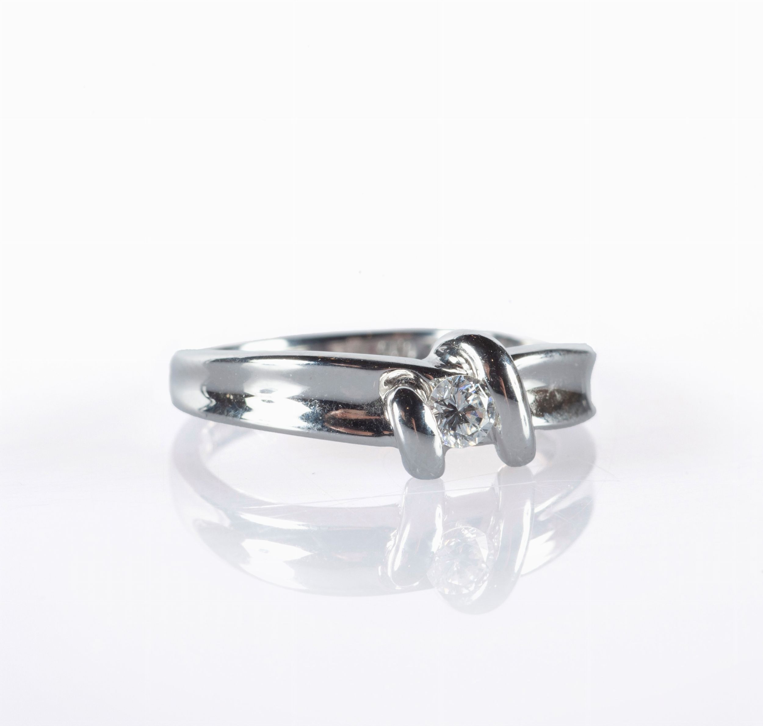 Oro bianco 750/000. Diamante in taglio rotondo brillante ct. 0,15 ca. , F-G, VVS. Peso complessivo gr. 4,20