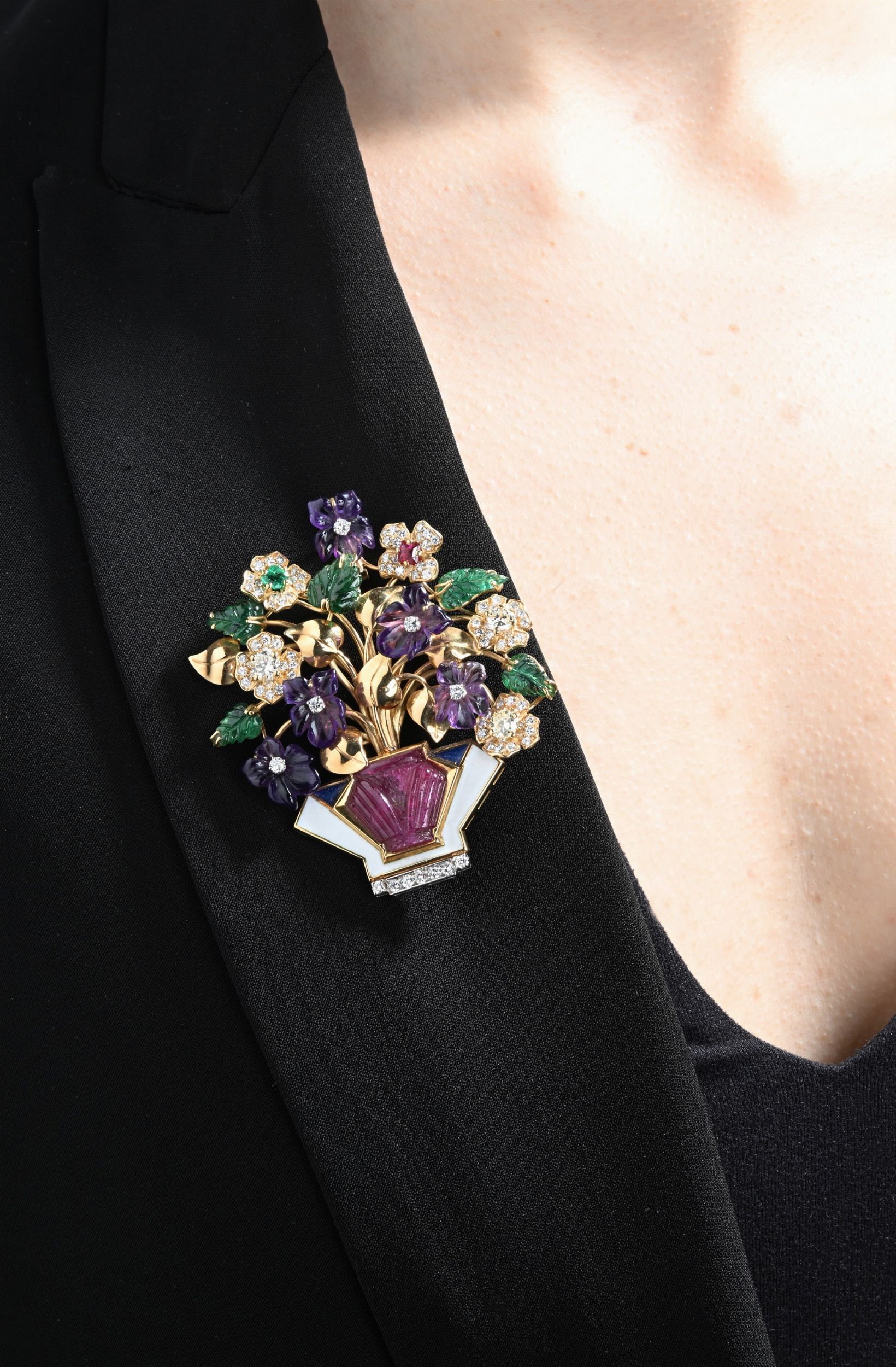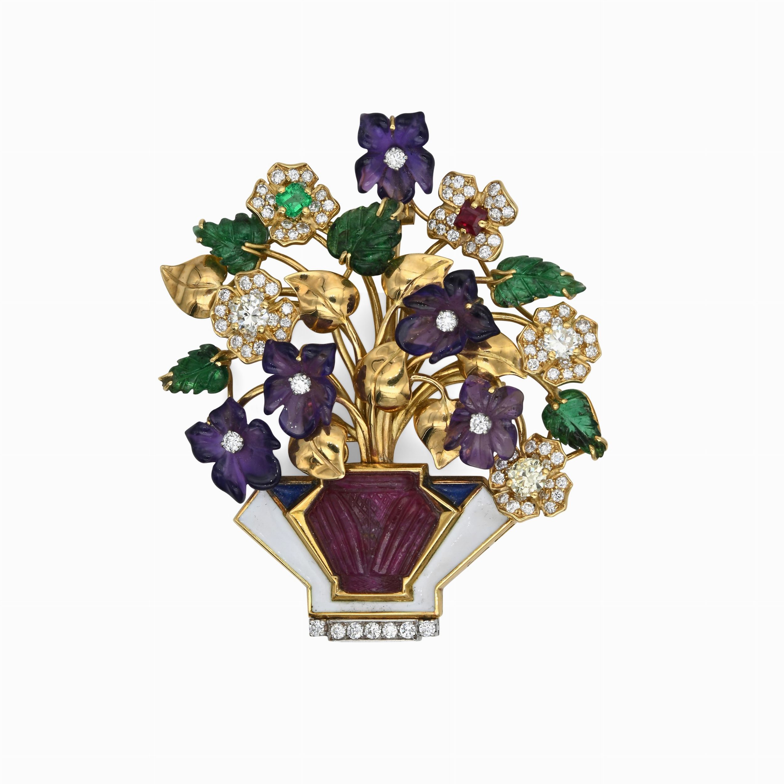 Oro giallo 750/000. Diamanti in taglio rotondo brillante 1,30 ca. Rubino naturale inciso ct. 8. Peso complessivo gr. 38,50