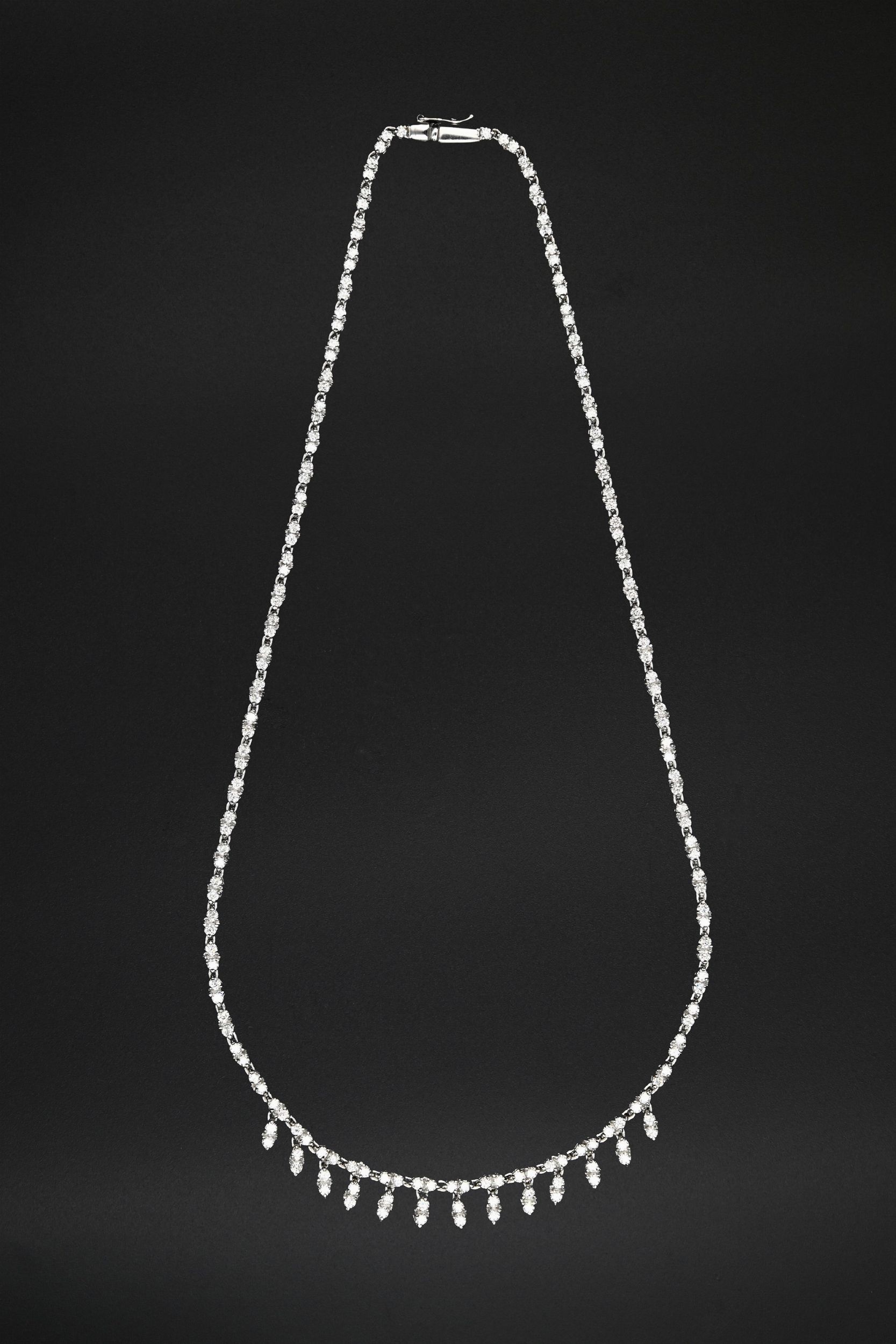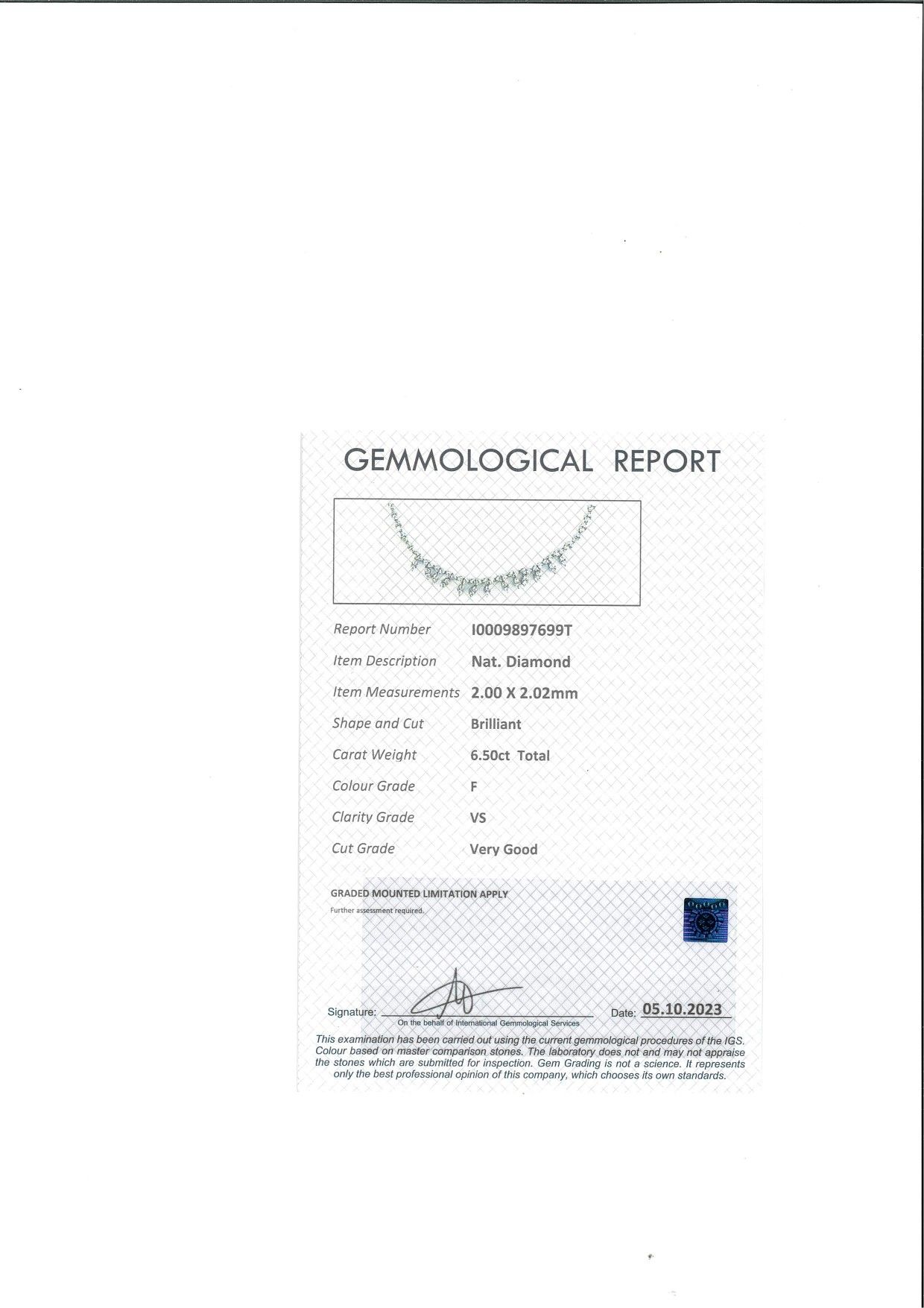 Oro bianco 750/000. Diamanti in taglio rotondo brillante ct. 6,50, F, VS. Peso complessivo gr. 23,50. Corredato di certificazione gemmologica.