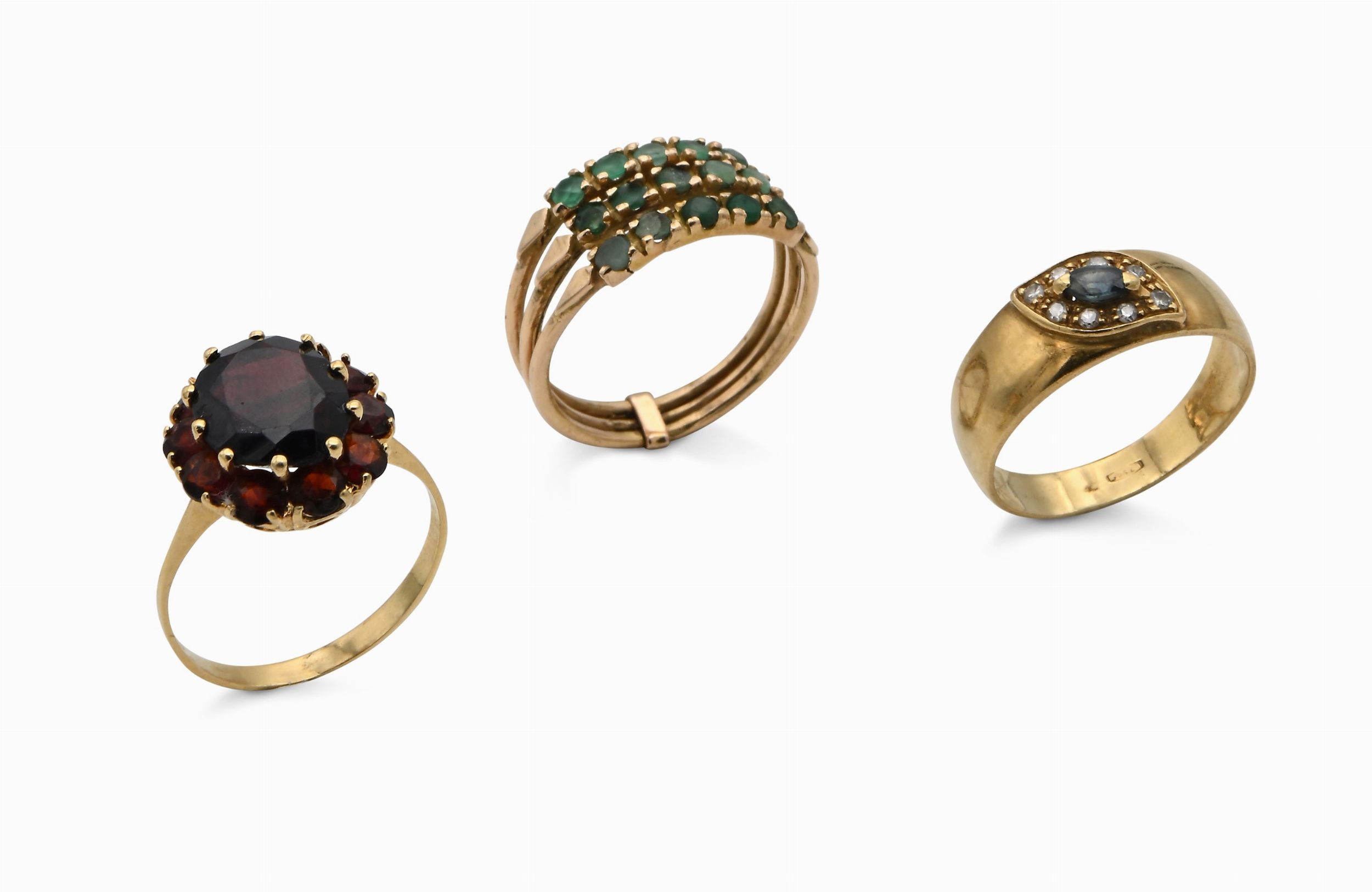 Gruppo di 3 anelli in oro, smeraldi, zaffiro e granati