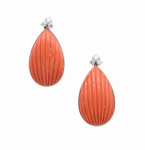 Lunghezza cm 6 Oro bianco 750/000. Corallo baccellato in taglio goccia mm. 45 x 28. Diamanti in taglio rotondo [..]