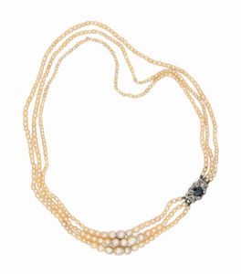 Lunghezza cm 42 Oro bianco 750/000. Diamanti in taglio rosa e zaffiro in taglio ovale. Perle naturali spontanee [..]