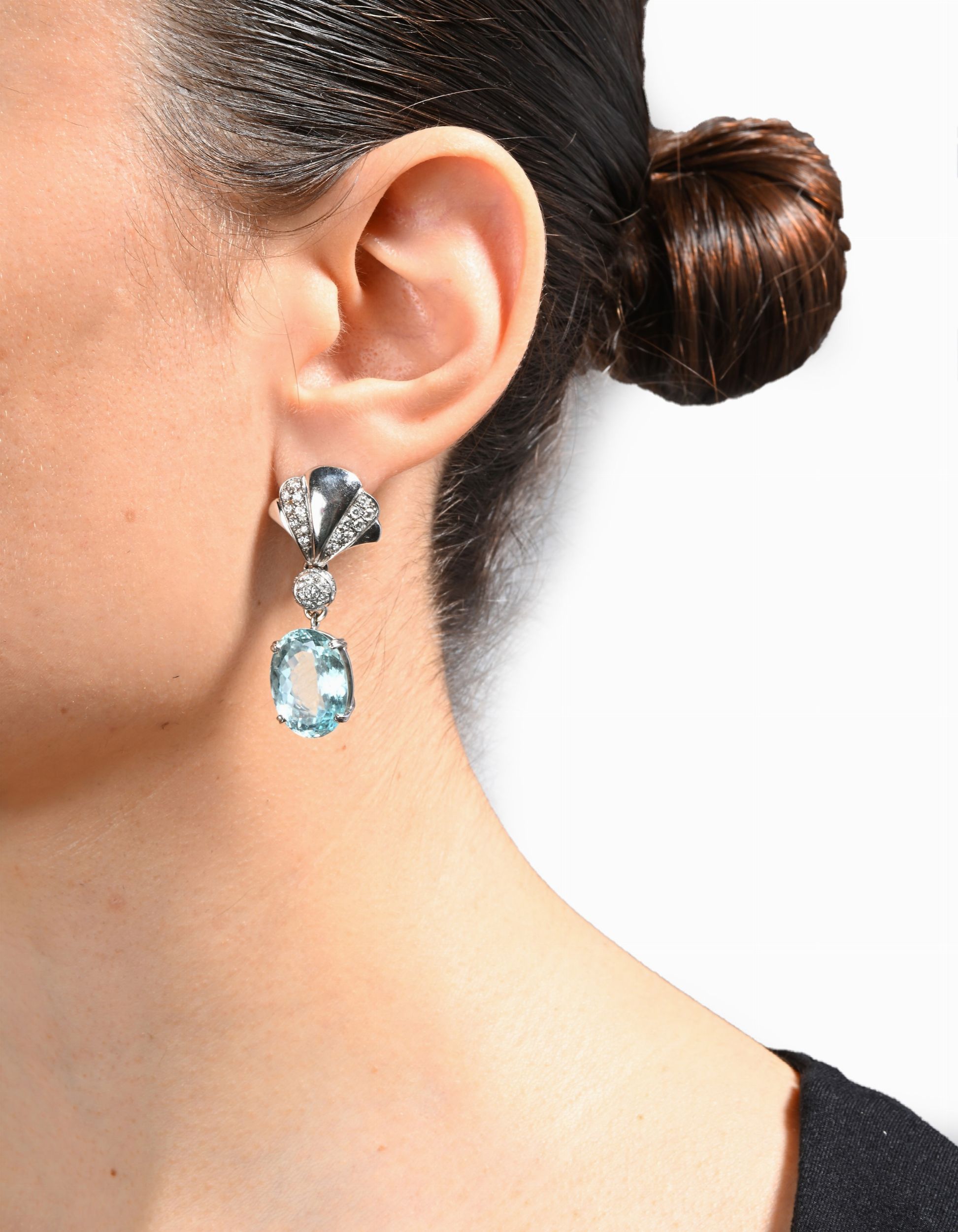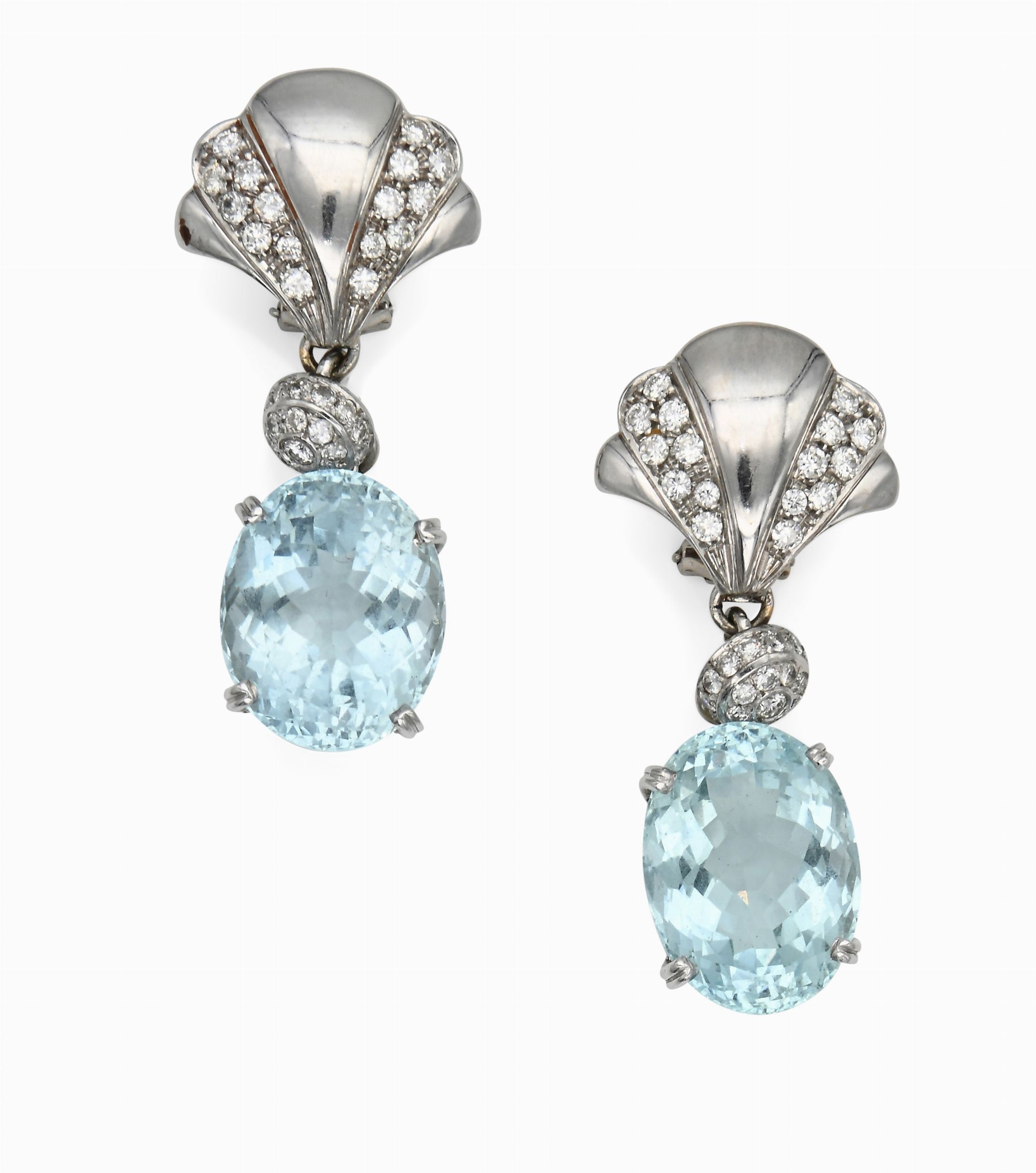 Oro bianco 750/000. Acquamarine naturali in taglio ovale ct. 22 ca. Diamanti in taglio rotondo brillante ct. 0,90 ca.. Peso complessivo gr. 23,10