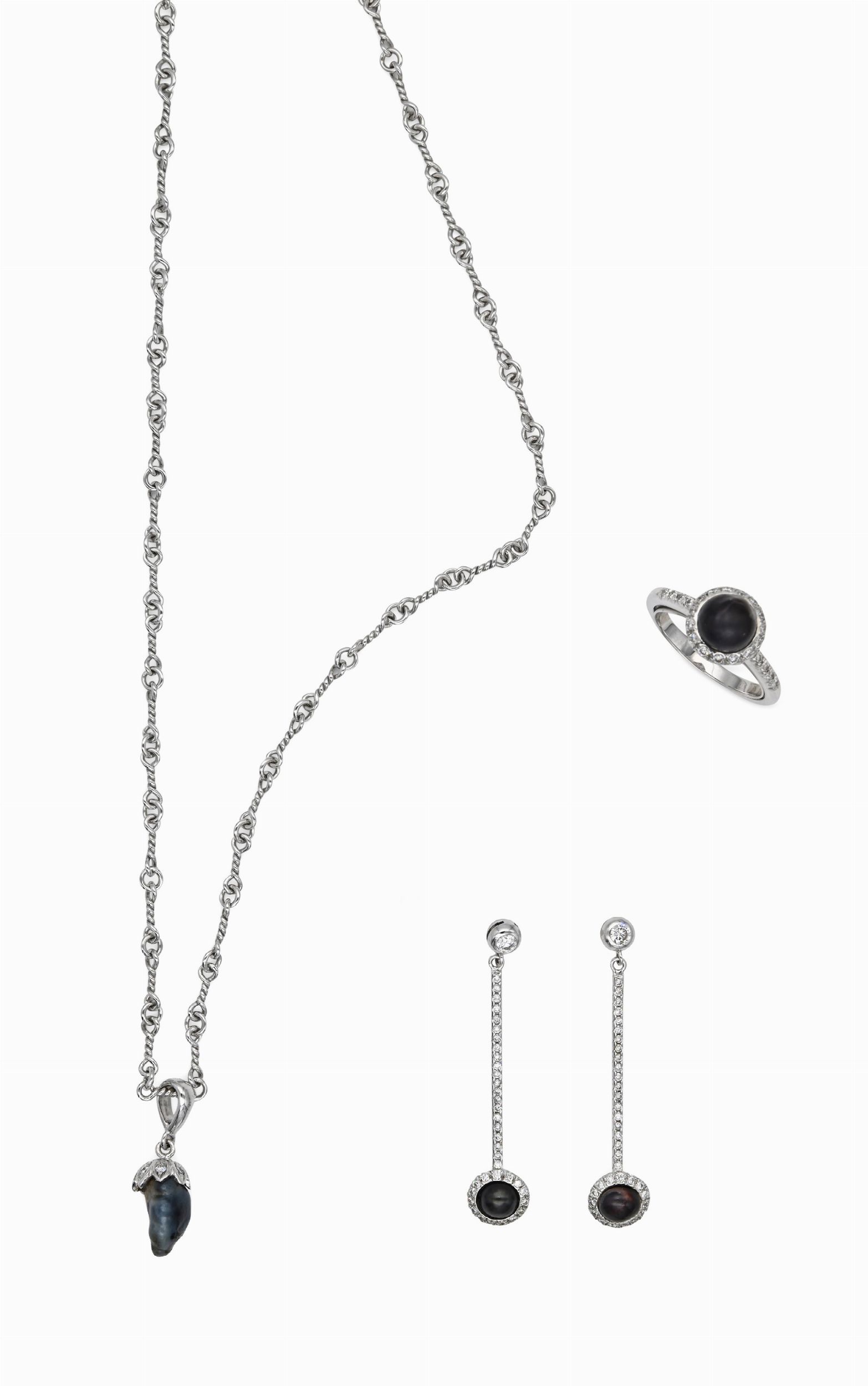 Parure di pendente, anello e coppia di orecchini in oro, brillanti e perle naturali [..]