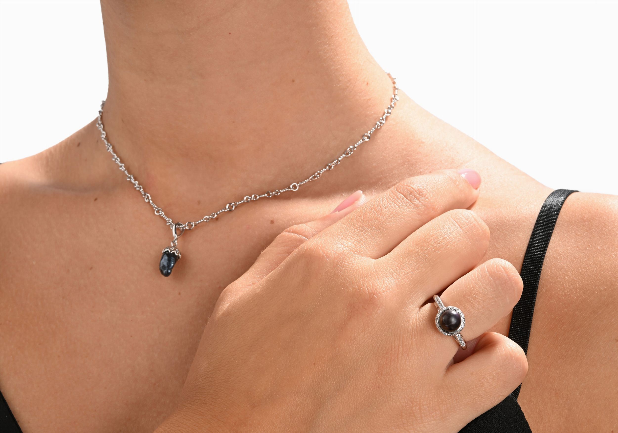 Lunghezza collana cm 40; orecchini lunghezza cm 5; anello misura 13