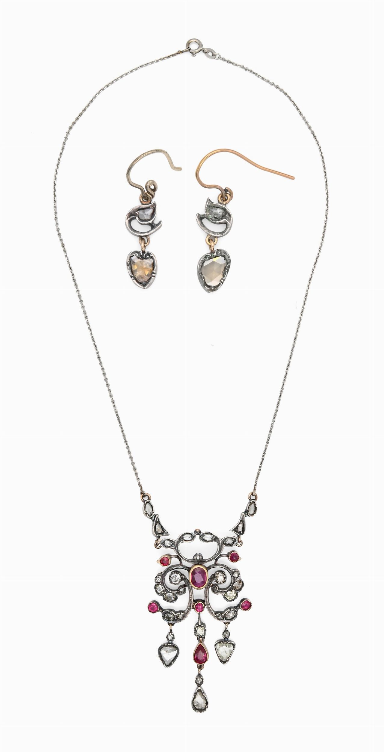 Parure di pendente e orecchini antica in oro, argento, diamanti e rubini