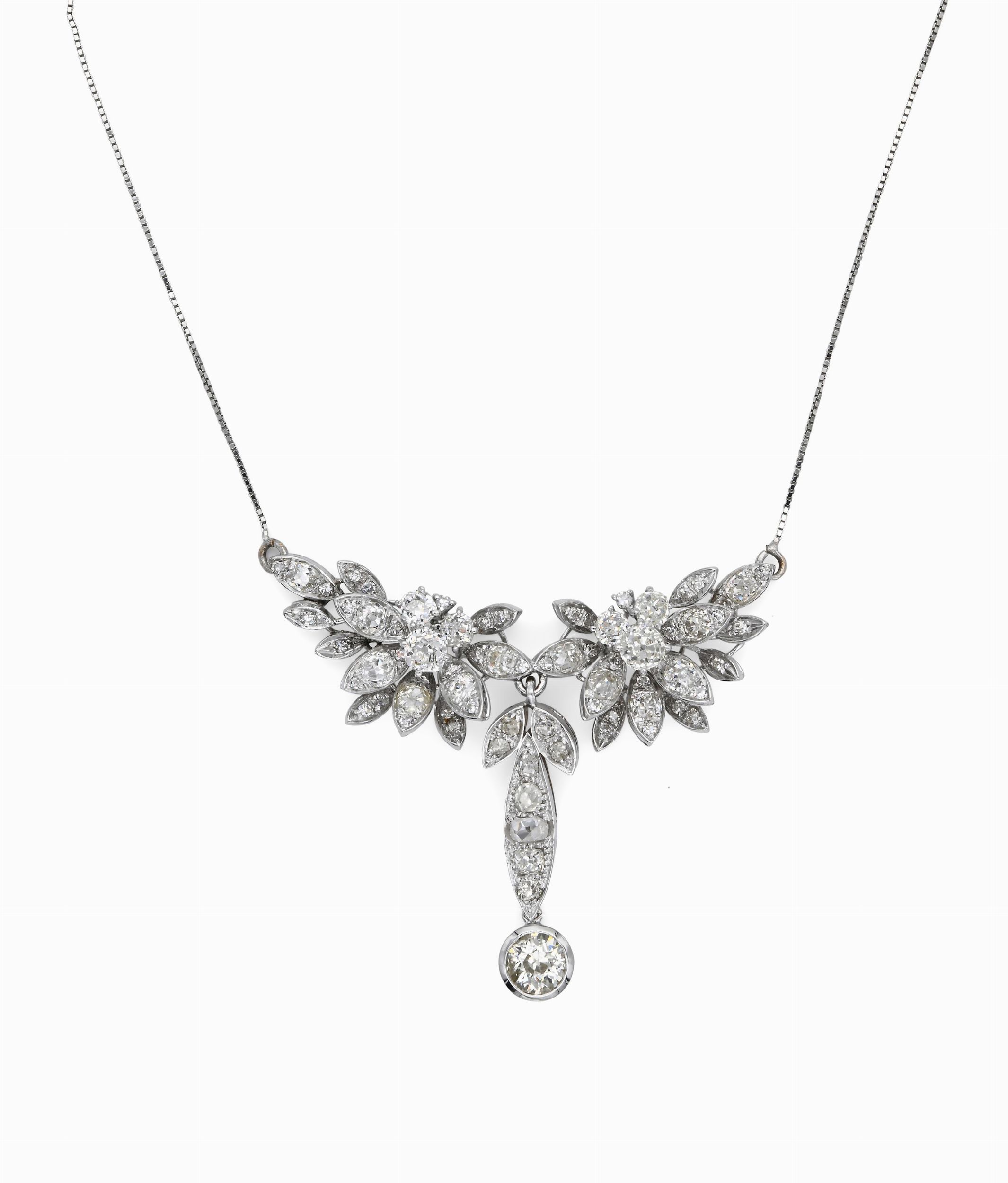 Oro bianco 750/000. Diamanti in taglio rotondo antico ct. 3,20 ca. Peso complessivo gr. 14,10