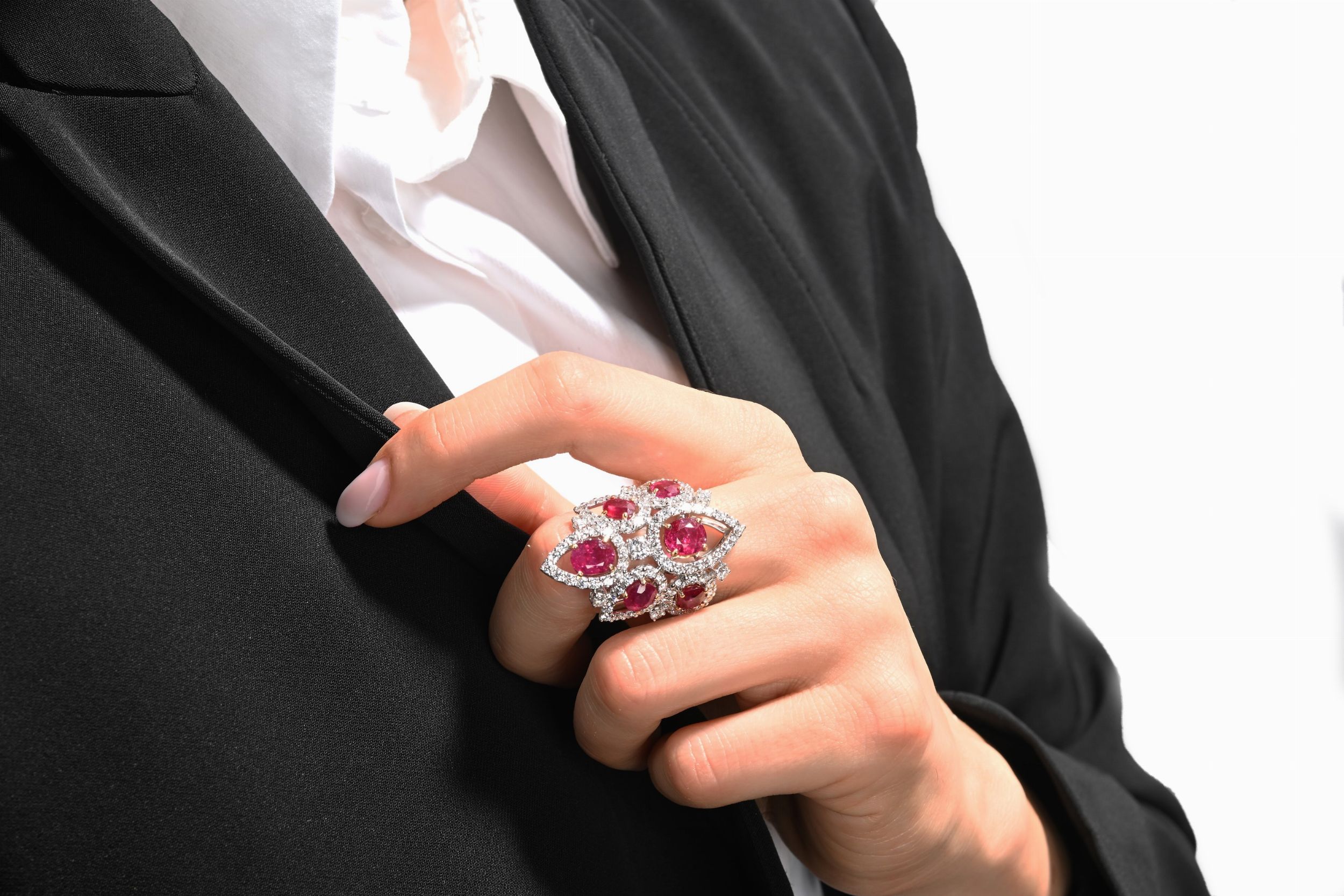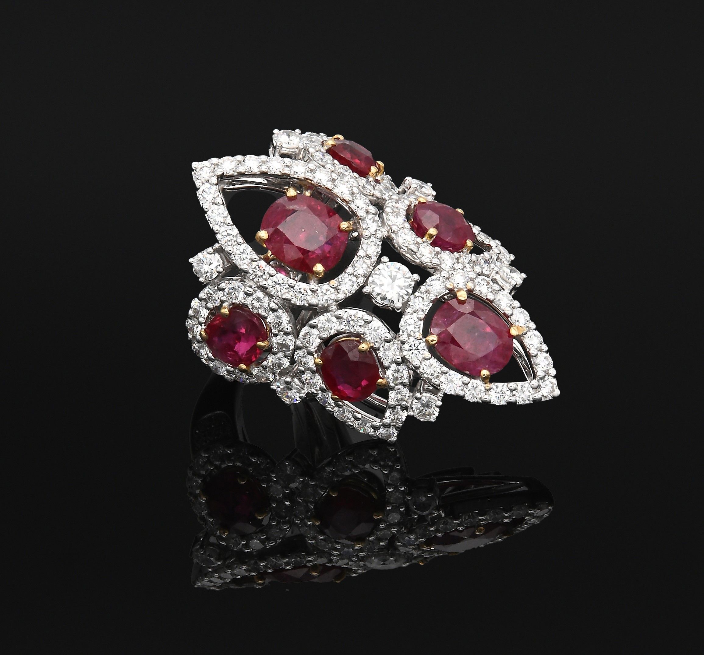 Oro bianco 750/000. Diamanti i taglio rotondo brillante ct. 3,25, F-G, IF-VVS. Rubini naturali in taglio ovale ct. 7,41, Myanmar (Birmania), SENZA INDICAZIONE DI TRATTAMENTO TERMICO. Corredati di certificazioni gemmologiche Gubelin, n° 18100154, n° 18100164, n° 18100187, n° 18100188, n°18100189, n°18100186.