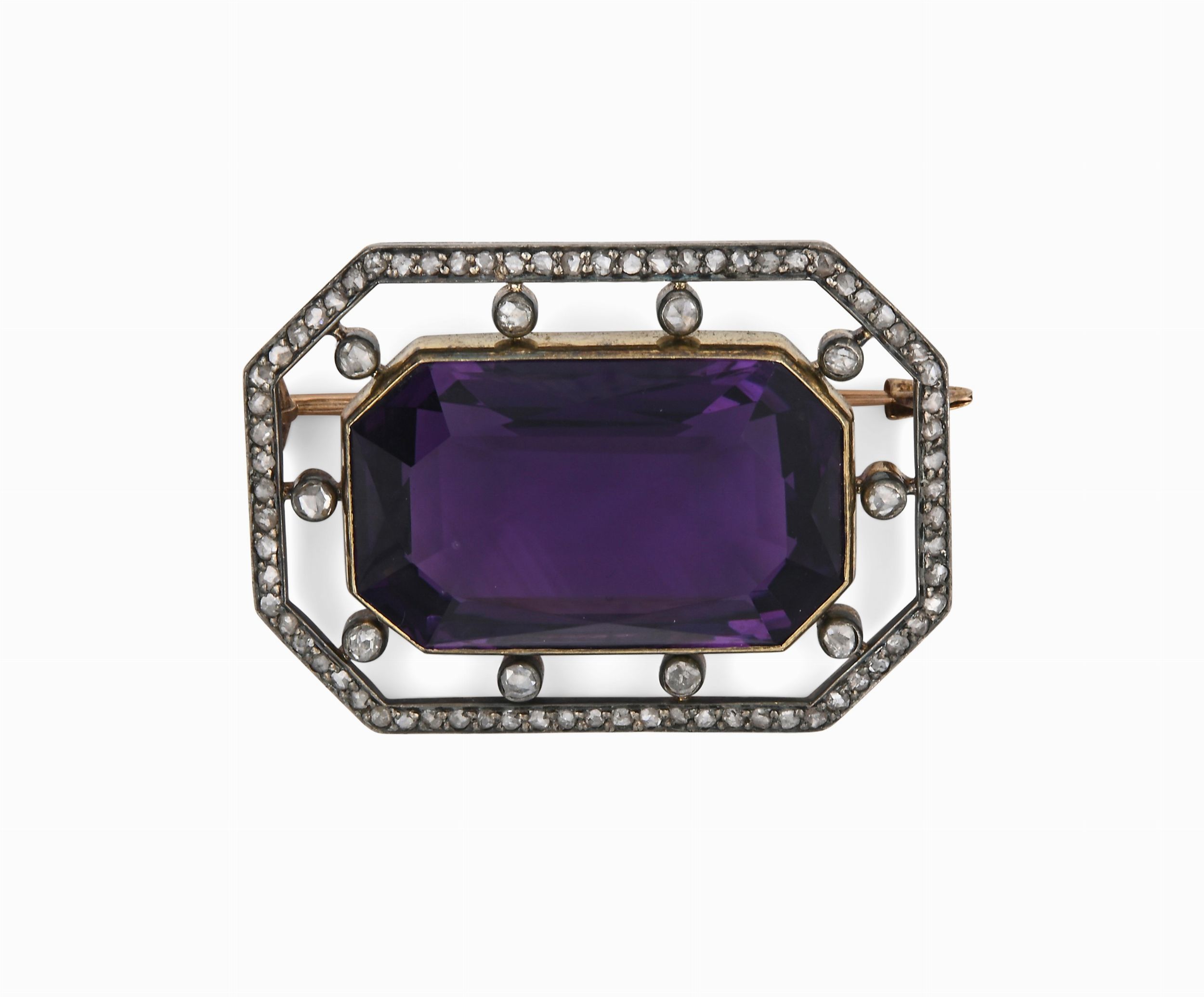 Spilla antica in oro, argento, ametista e diamanti