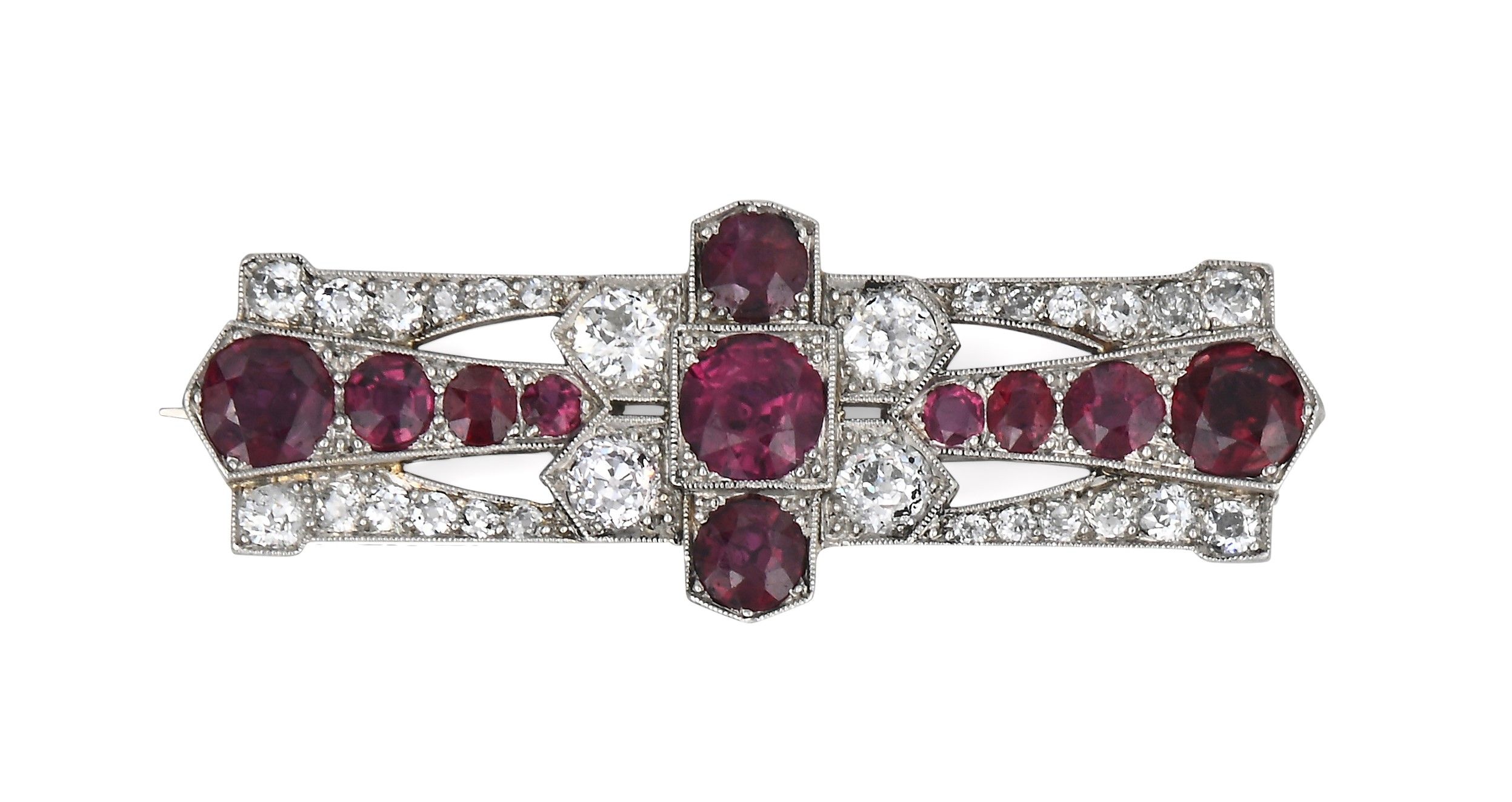 Platino 950/000. Rubini birmani in taglio cuscino ct. 3,30 ca. diamanti in taglio vecchia Europa ct. 1,60 ca. Peso complessivo gr. 8,10