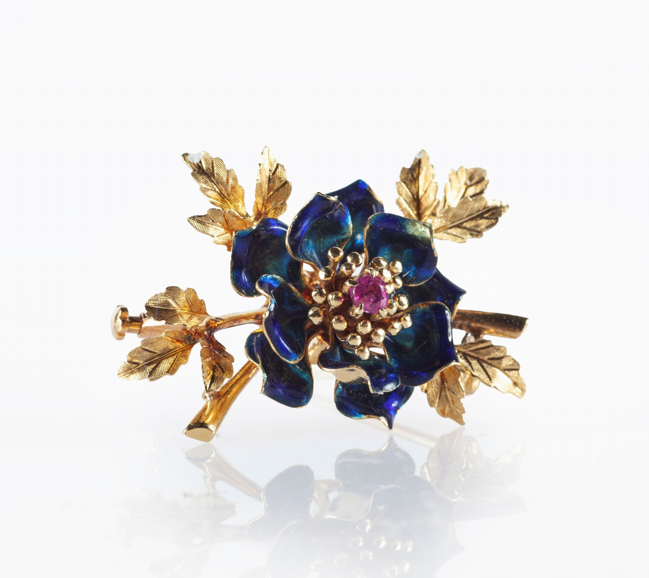 Spilla in oro, smalti, brillanti e rubini
