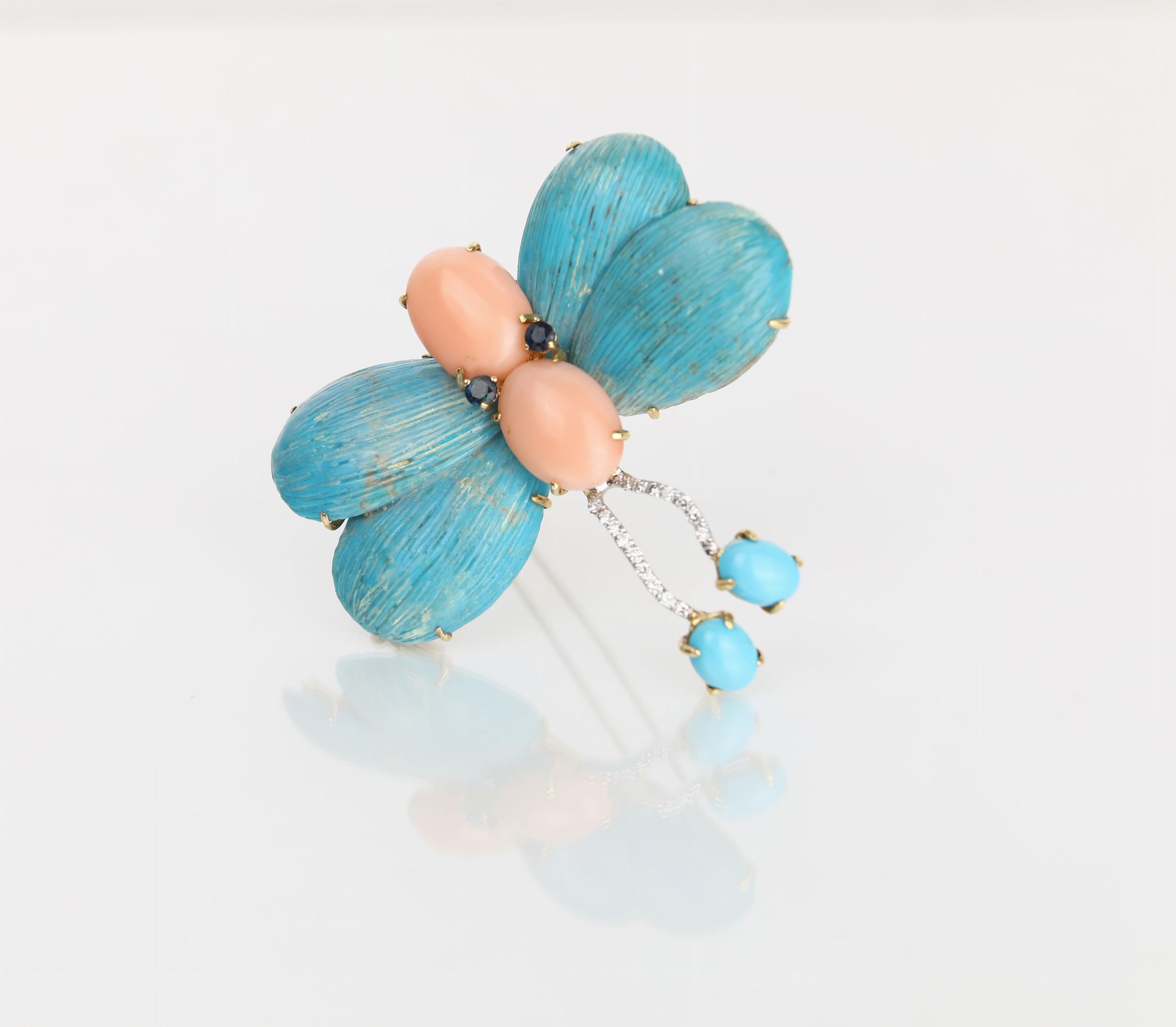 Spilla libellula in oro, turchese, corallo zaffiri e brillanti.