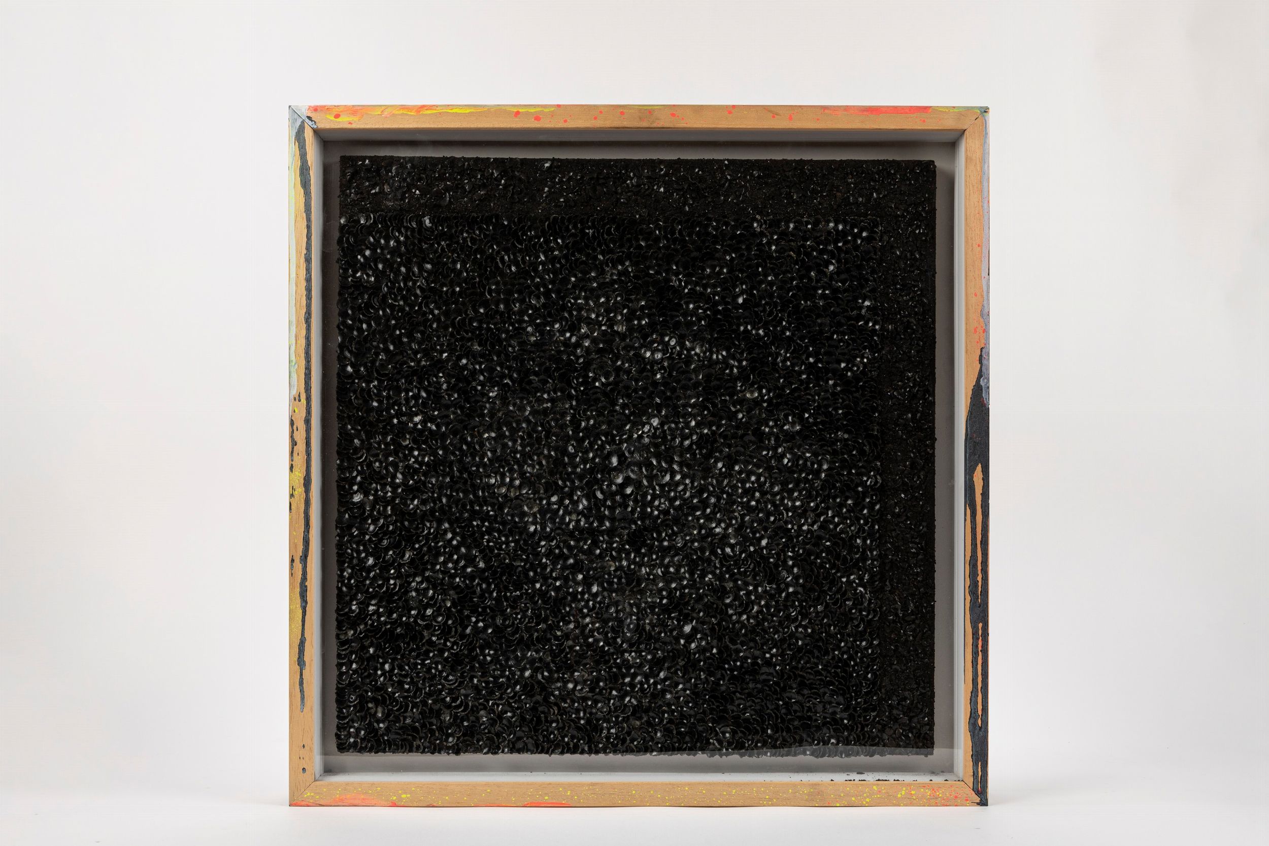 tecnica mista e scorie di ferro su tavola, cm 55 x 55