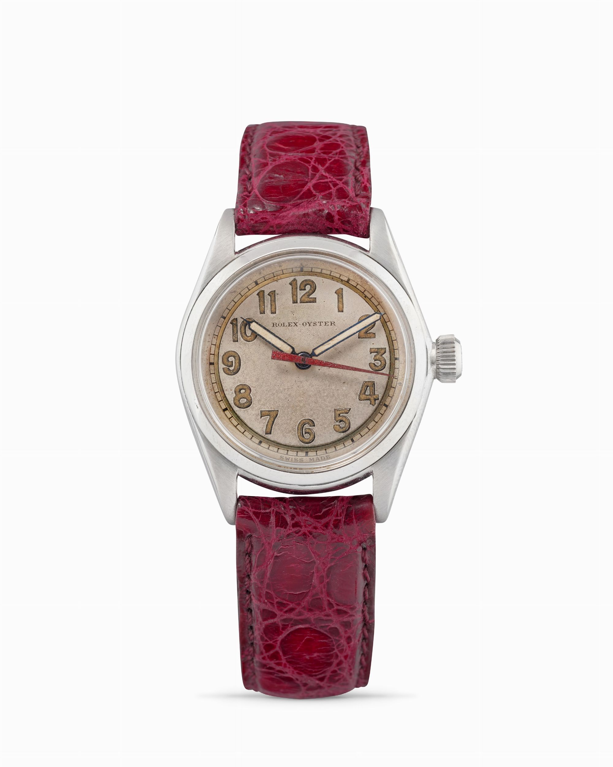 anni 40 Cassa rotonda in acciaio, n.113710. Quadrante color crema, numeri arabi luminescenti. Movimento a carica manuale. Cinturino in pelle e fibbia Rolex in acciaio. Dimensioni: 29 mm.