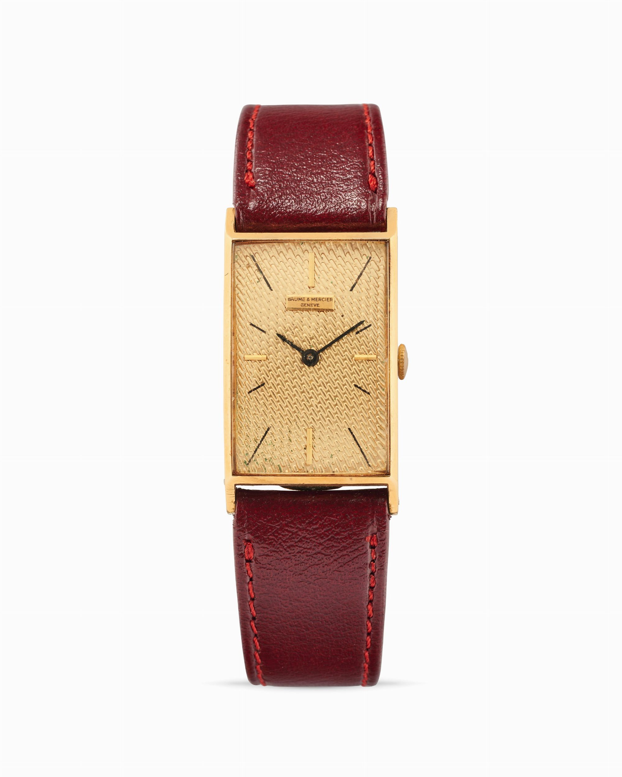 anni 70 Cassa rettangolare in oro 18k. Quadrante in oro con finitura guilloché, indici applicati e dipinti. Movimento a carica manuale. Cinturino in pelle. Dimensioni: 35 x 20 mm.