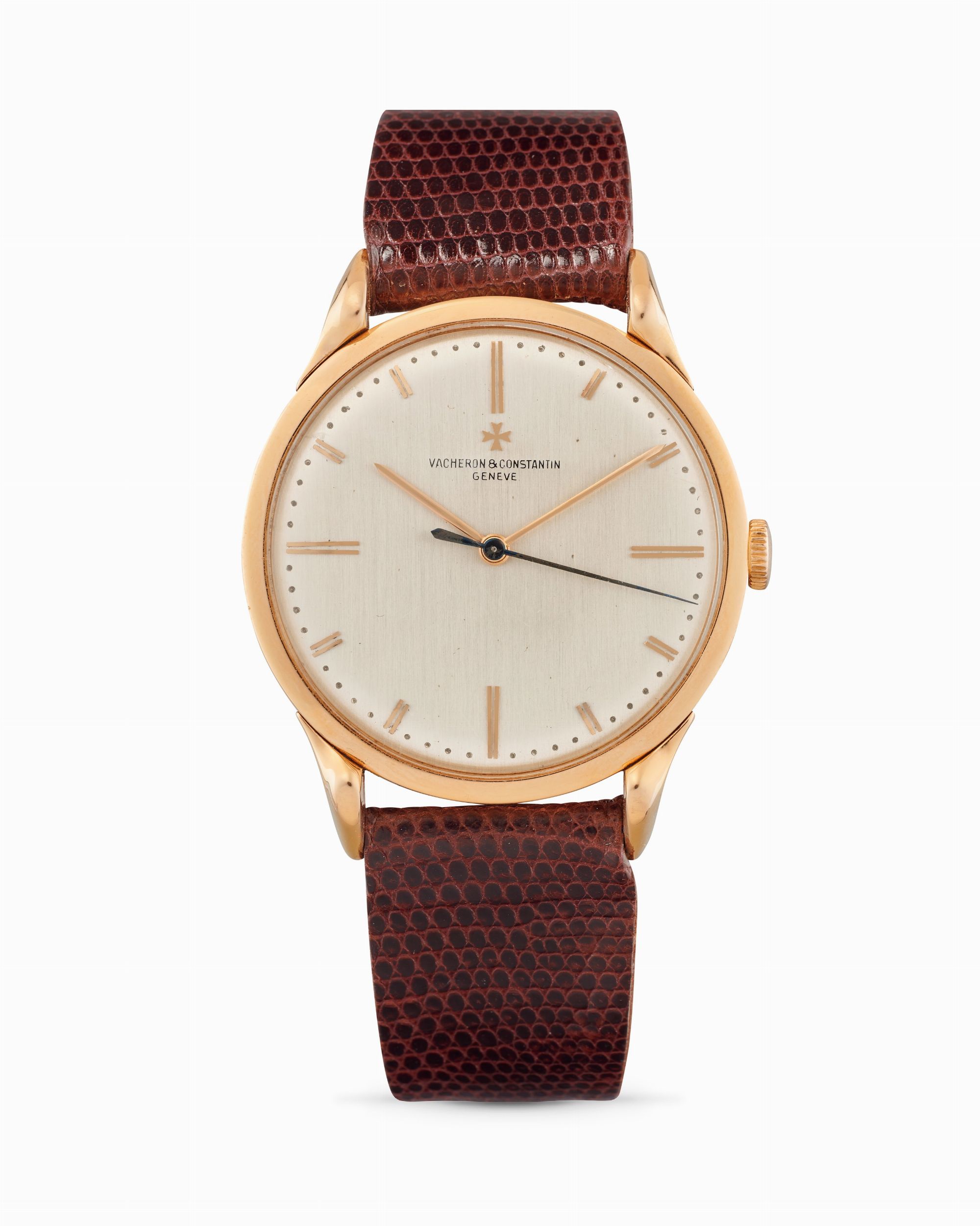 anni 50 Cassa rotonda in oro rosa 18k, n.312114, anse ad artiglio. Quadrante argenté con finitura satinata, indici applicati. Movimento a carica manuale, cal.P454, n.475414. Cinturino in pelle e fibbia Vacheron Constantin in oro. Dimensioni: 36 mm.